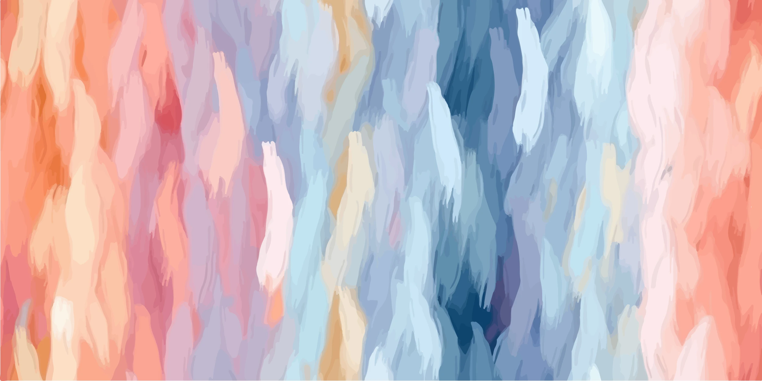 Ce papier peint artistique révèle un fascinant jeu de textures et de nuances qui évoque l’art de l’aquarelle contemporaine. Les tons corail et orange s’épanouissent sur la partie gauche, rappelant un coucher de soleil embrasé, tandis que les nuances bleues et indigo dominent la droite, évoquant les profondeurs océaniques ou un ciel d’orage. Au centre, un délicat dégradé de couleurs pastel crée une transition harmonieuse, mêlant roses poudrés, blancs nacrés et tons beiges dorés. La technique picturale s’apparente à un effet tie-dye sophistiqué ou à une peinture abstraite fluide, où chaque coulée semble avoir été guidée par une main d’artiste experte.
