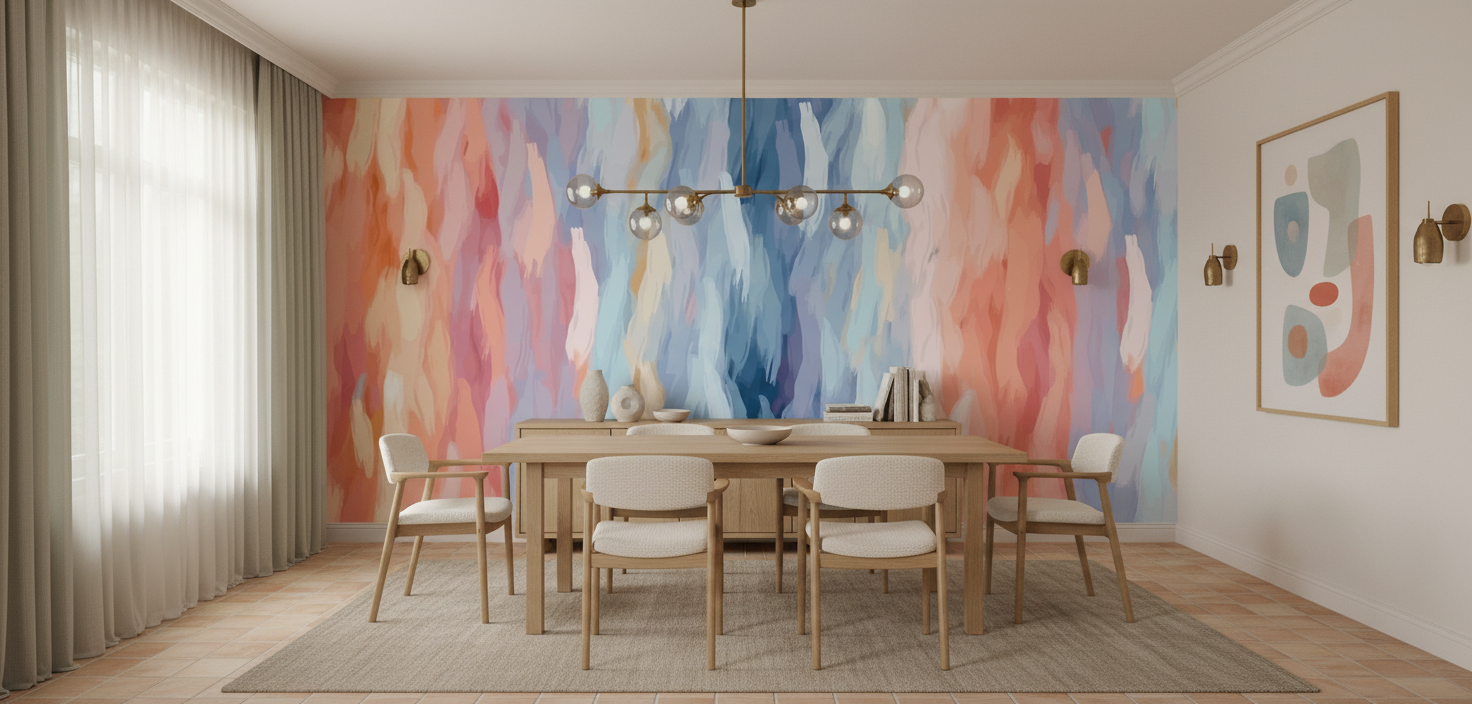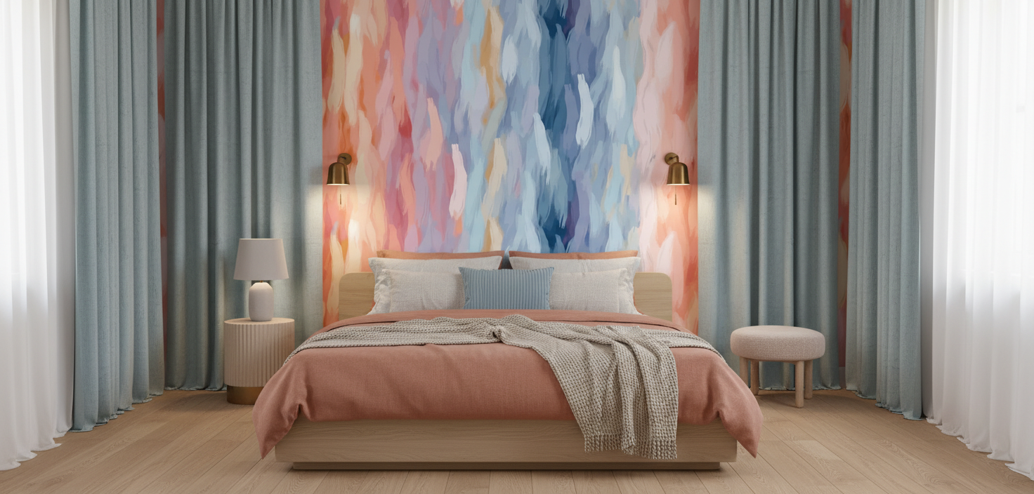 Ce papier peint abstrait trouve sa place idéale dans un salon moderne où il habillera avec élégance le mur principal, créant un point focal saisissant. Dans une chambre parentale, il apportera une dimension relaxante derrière la tête de lit, favorisant la détente et l’évasion. Pour un bureau créatif ou un espace de méditation, ce revêtement stimule l’inspiration tout en préservant une atmosphère sereine. Associez-le à du mobilier en bois clair, des textiles en lin naturel ou en velours bleu nuit, et des accessoires en laiton brossé pour créer un ensemble harmonieux. Les tons neutres comme le blanc cassé, le beige lin ou le gris perle complèteront parfaitement cette palette artistique.