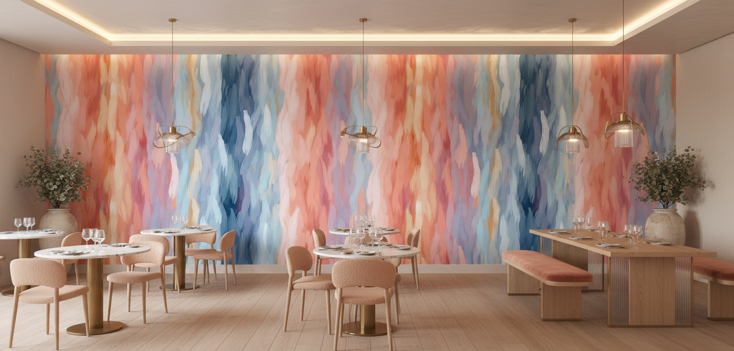L’atmosphère qui se dégage de ce papier peint design est à la fois apaisante et énergisante. Il insuffle une sensation de mouvement perpétuel, comme si les couleurs continuaient de se transformer sous vos yeux. Cette création murale génère une ambiance zen et moderne, parfaite pour créer un cocon de sérénité tout en apportant une touche d’originalité artistique. L’effet visuel produit une impression de profondeur et de fluidité, transformant instantanément l’espace en galerie d’art contemporain.