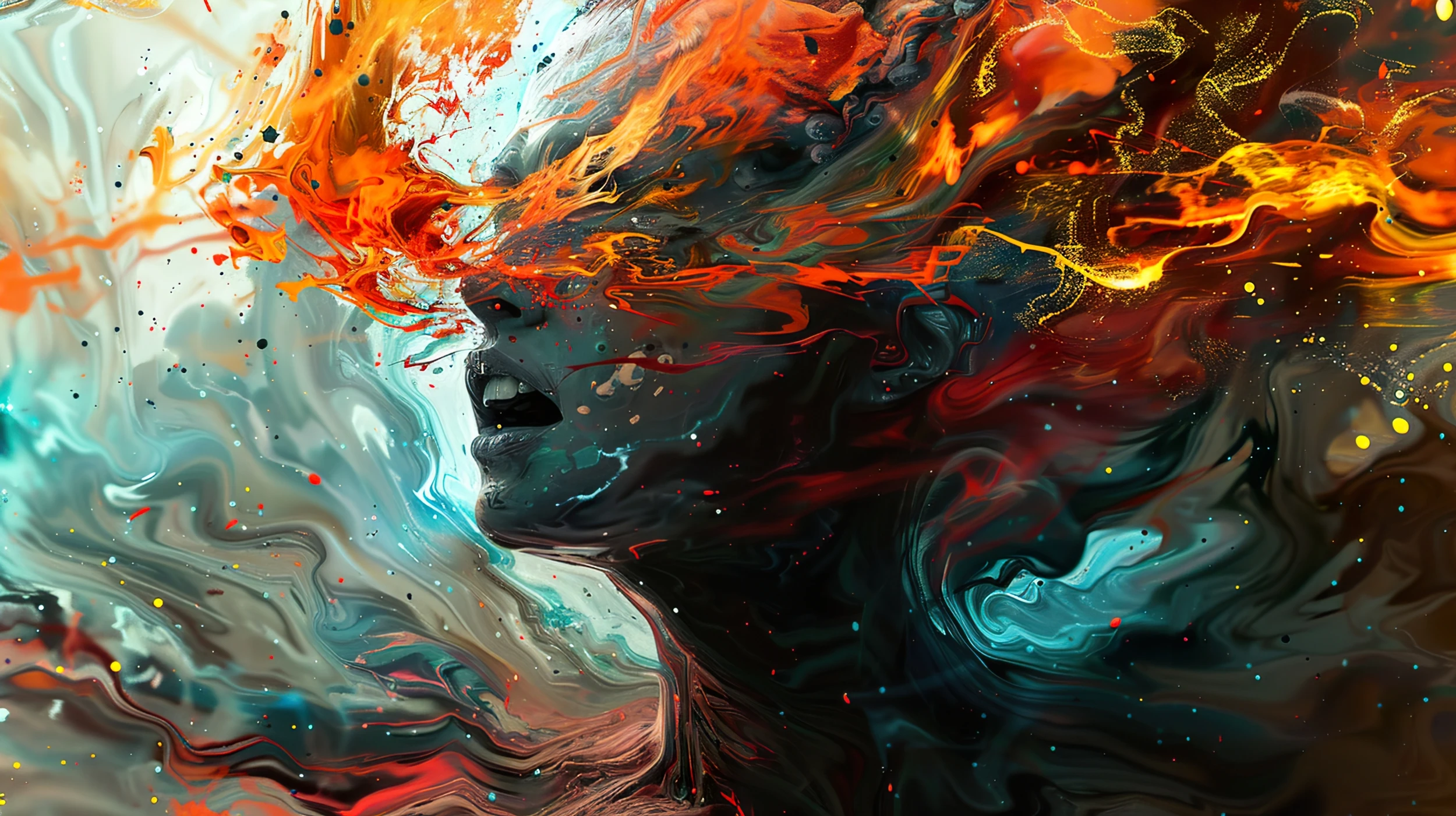 Ce papier peint abstrait contemporain révèle un spectacle saisissant de nuances flamboyantes qui fusionnent et tourbillonnent dans une danse éternelle. Les tons orange éclatants et les rouge vermillon explosent comme des éruptions solaires, contrastant magnifiquement avec des bleus turquoise profonds et des gris anthracite sophistiqués. Cette peinture fluide abstraite évoque la technique du fluid art ou de l’art mural moderne, où chaque coulée de pigment raconte une histoire unique.