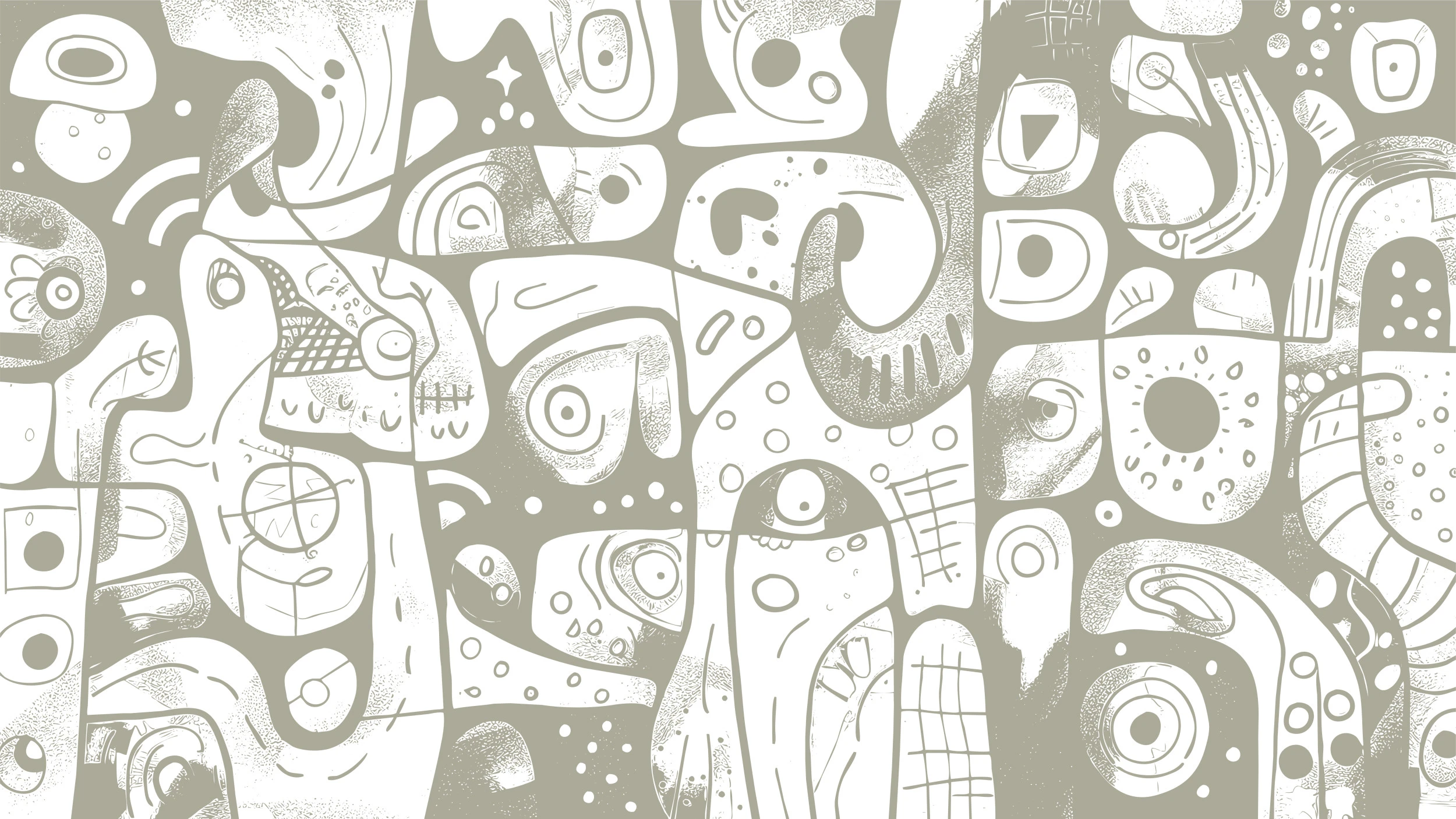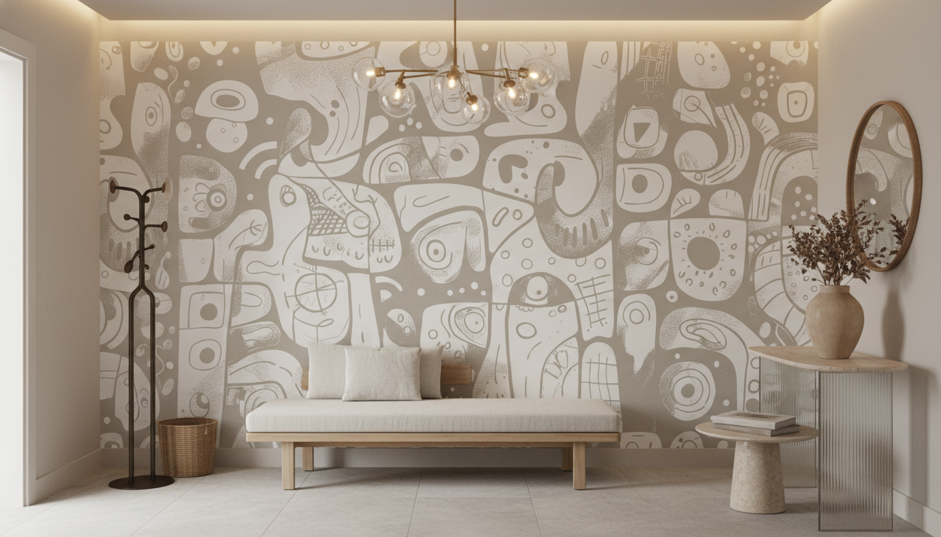 Ce papier peint artistique déploie un kaléidoscope de formes organiques et géométriques qui évoquent les pétroglyphes ancestraux et l’art rupestre revisité. Chaque élément dessine une cartographie imaginaire : visages stylisés aux traits épurés, motifs tribaux contemporains, spirales hypnotiques et formes biomorphes qui semblent danser dans un ballet silencieux. Le style graphique minimaliste joue sur les contrastes subtils entre les zones pleines et les espaces négatifs, créant une profondeur visuelle saisissante. La palette chromatique douce oscille entre un beige poudreux et des blancs nuancés, ponctuée de gris tendres qui apportent une sophistication naturelle à l’ensemble.