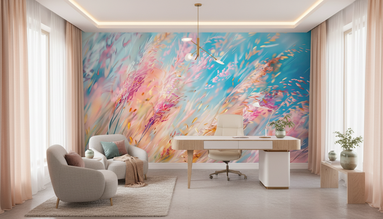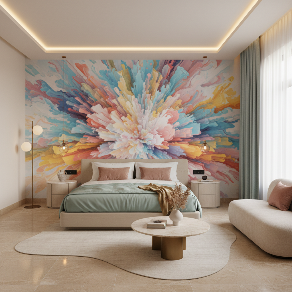 Ce revêtement mural d’exception trouve sa place idéale dans un salon contemporain où il devient naturellement le point focal de la décoration. Parfait pour une chambre parentale moderne, il apporte une touche artistique raffinée qui favorise la détente. Dans un bureau créatif ou un atelier, ce papier peint stimule l’imagination et la productivité. Associez-le à du mobilier minimaliste aux lignes épurées, des matières naturelles comme le bois clair ou le rotin, et des textiles dans des tons neutres pour laisser l’œuvre s’exprimer pleinement. Des accents métalliques en laiton doré ou en cuivre rosé créeront des échos subtils avec les nuances chaudes de la composition.