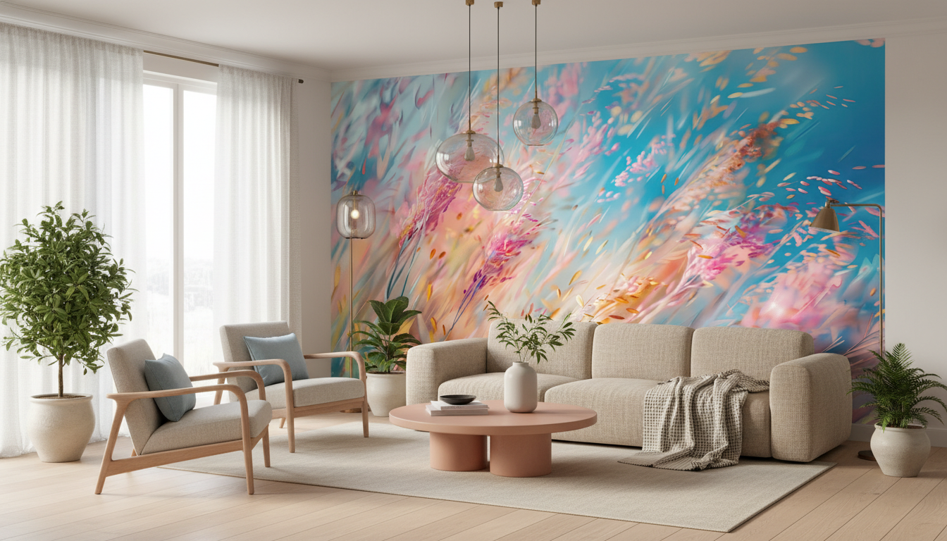 Ce papier peint abstrait moderne révèle une composition artistique d’une rare intensité, où se mélangent harmonieusement des tons turquoise éclatants, des roses tendres et des oranges chaleureux. Les traits fluides et expressifs évoquent la technique de la peinture à l’huile gestuelle, créant un effet de mouvement perpétuel qui captive le regard. Cette création artistique contemporaine présente des éclaboussures de couleurs qui se fondent naturellement dans un dégradé impressionniste, rappelant les plus belles toiles d’art moderne. Les nuances pastel dominent la composition, ponctuées de touches plus vives qui apportent dynamisme et profondeur à l’ensemble.