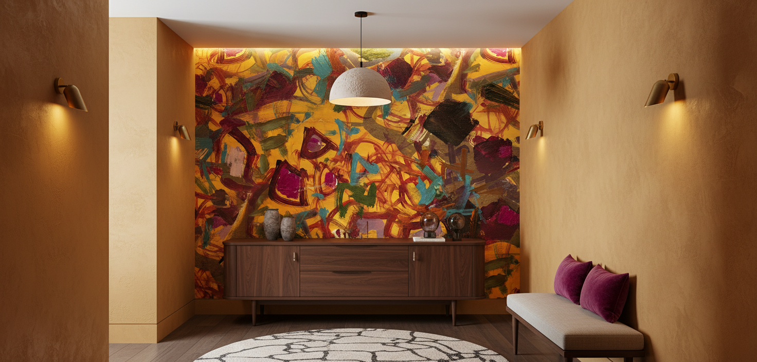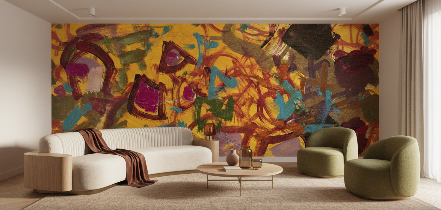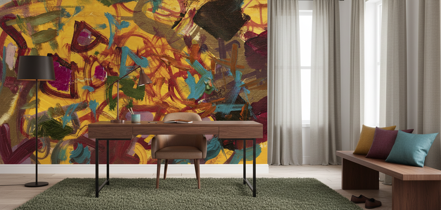 Ce papier peint design trouve sa place idéale dans un salon contemporain, où il devient le point focal d’une décoration audacieuse. Parfait pour habiller un mur d’accent dans un bureau créatif ou une chambre d’artiste, il sublime également les espaces de réception comme une salle à manger moderne. Associez-le à du mobilier en bois naturel pour tempérer son intensité, ou optez pour des meubles noirs mat qui feront ressortir l’éclat de ses couleurs. Les matières brutes comme le lin écru, le jute naturel ou le cuir vieilli créent un contraste harmonieux avec cette explosion picturale. Complétez l’ensemble avec des accessoires déco dans les tons neutres : coussins beiges, plaids en laine naturelle et luminaires en laiton brossé.