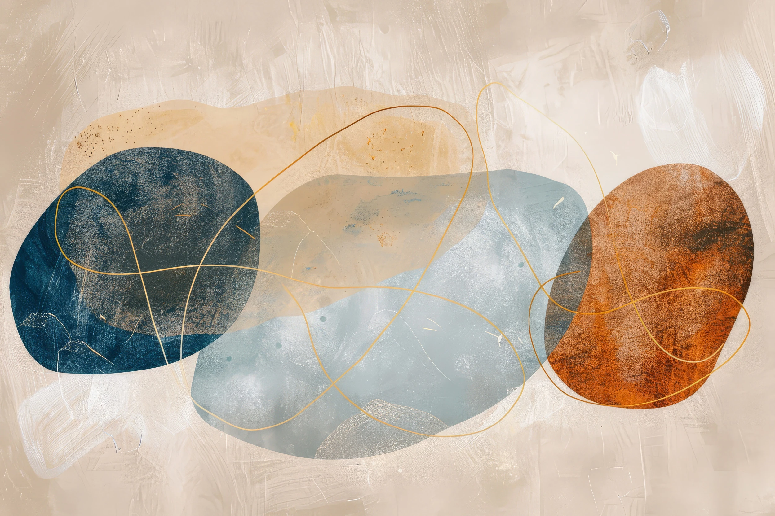 Cette création remarquable présente un motif abstrait organique composé de trois formes ovales majestueuses qui semblent flotter dans un espace onirique. La forme bleue profonde, aux nuances d’encre et d’océan nocturne, dialogue harmonieusement avec une silhouette terracotta aux reflets cuivrés, tandis qu’une troisième forme translucide, teintée de gris perle et d’azur délicat, unit ces éléments dans une symphonie visuelle apaisante. Des lignes dorées fluides serpentent à travers la composition, créant un réseau de connexions subtiles qui évoquent les courants marins ou les vents célestes. Le fond texturé beige rappelle la douceur d’un parchemin ancien, conférant à l’ensemble une sophistication intemporelle.