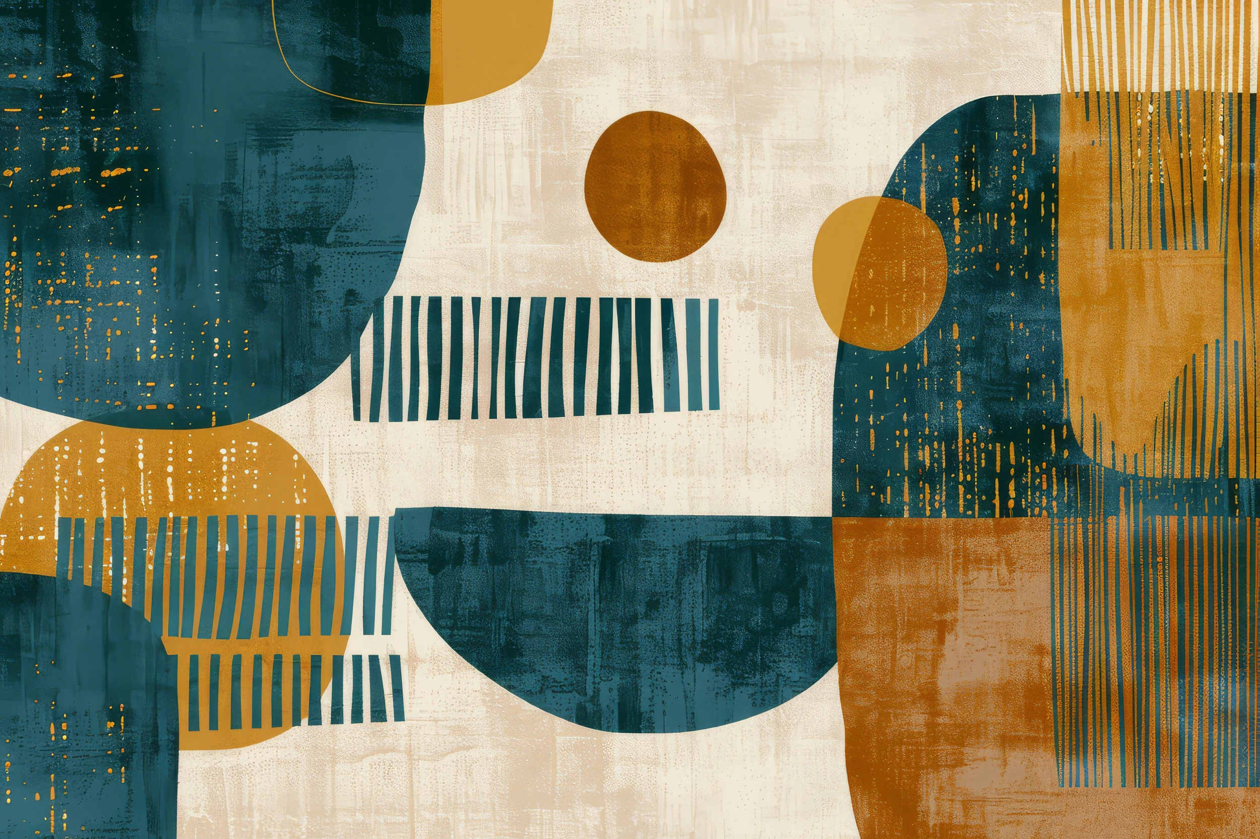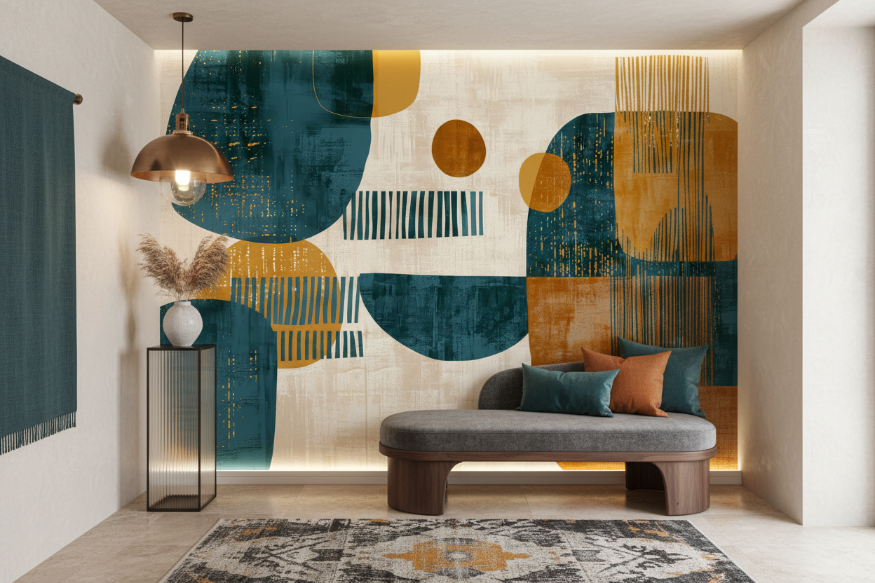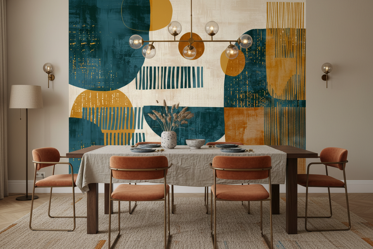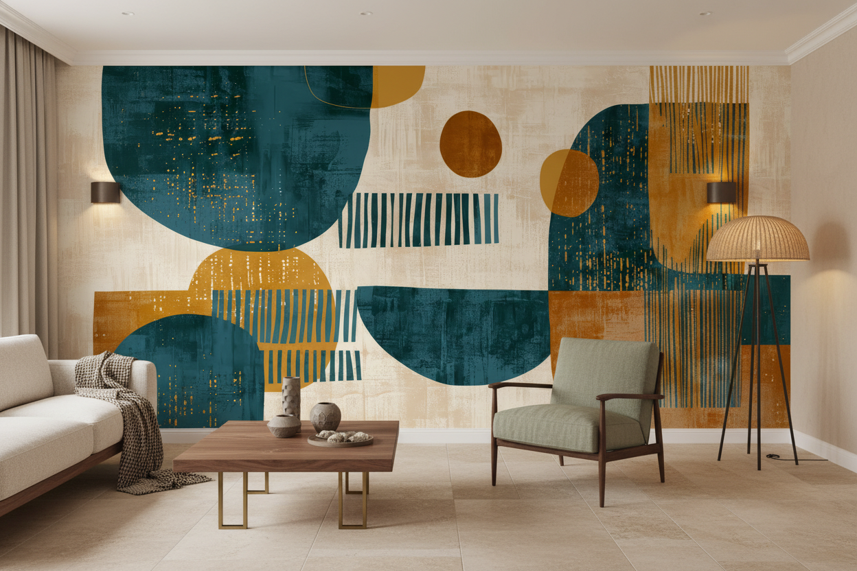 Papier Peint Abstrait Géométrique – Symphonie Moderne en Bleu Canard et Ocre