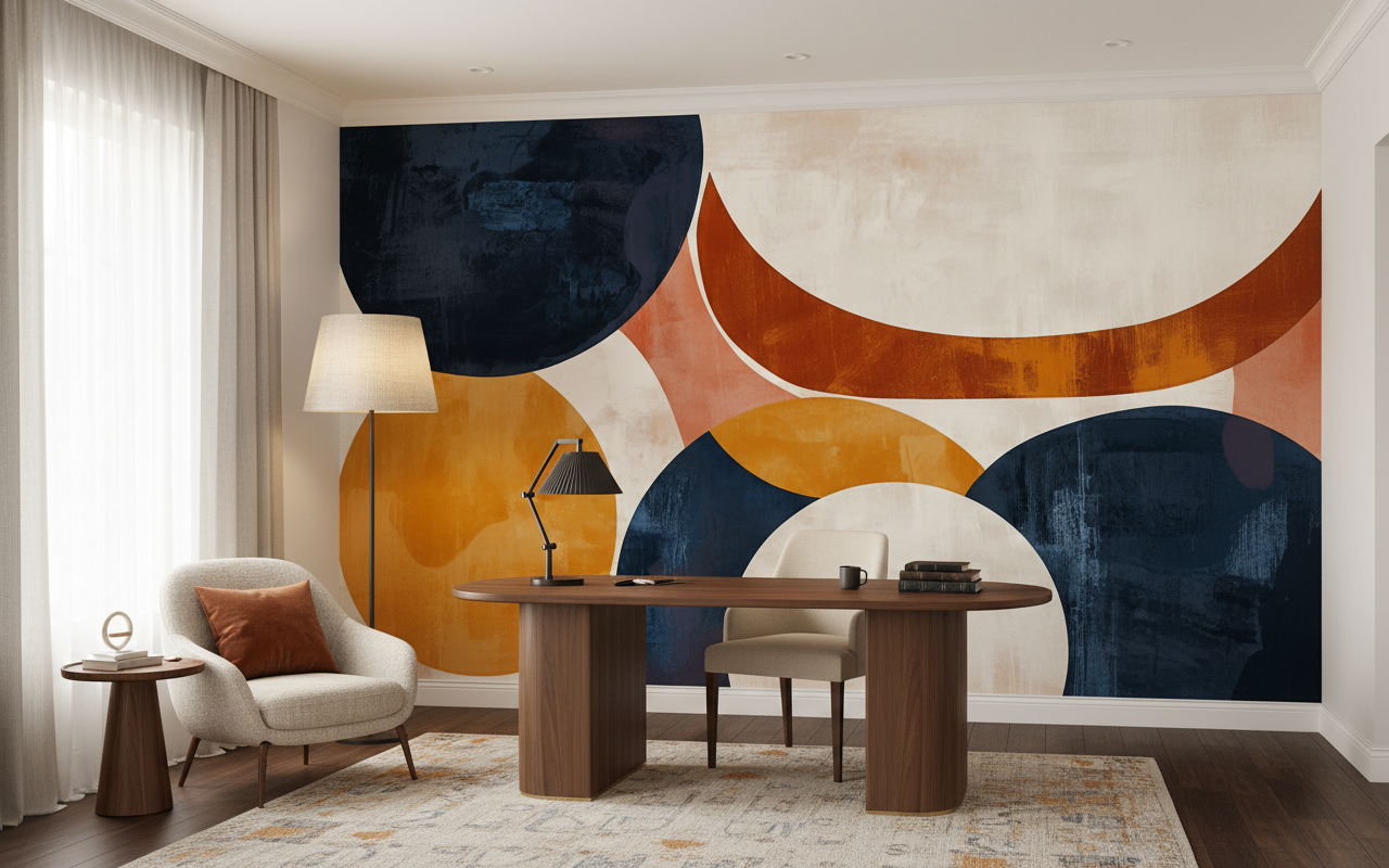 Cette décoration murale contemporaine instaure une atmosphère à la fois sophistiquée et chaleureuse, créant un environnement propice à la contemplation et à la créativité. L’effet visuel produit évoque les mouvements artistiques du milieu du siècle, rappelant l’esthétique mid-century modern tout en s’inscrivant résolument dans une démarche décorative actuelle.
