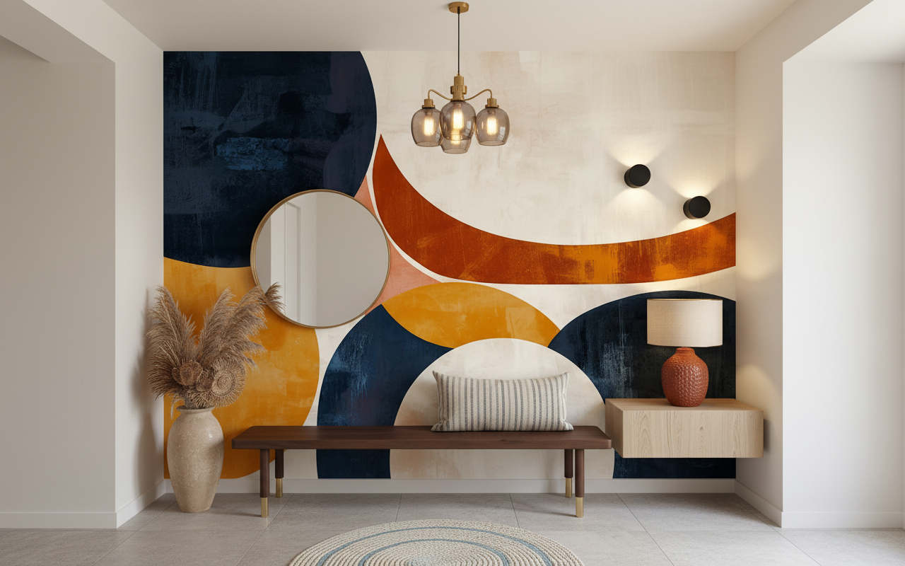 Pour sublimer ce revêtement mural artistique, associez-le à des tons neutres chauds comme le beige rosé ou le blanc cassé sur les murs adjacents. Des éléments décoratifs en céramique artisanale, des coussins aux textures variées dans les mêmes tonalités, ou encore des luminaires en métal cuivré viendront créer un ensemble décoratif cohérent et raffiné.