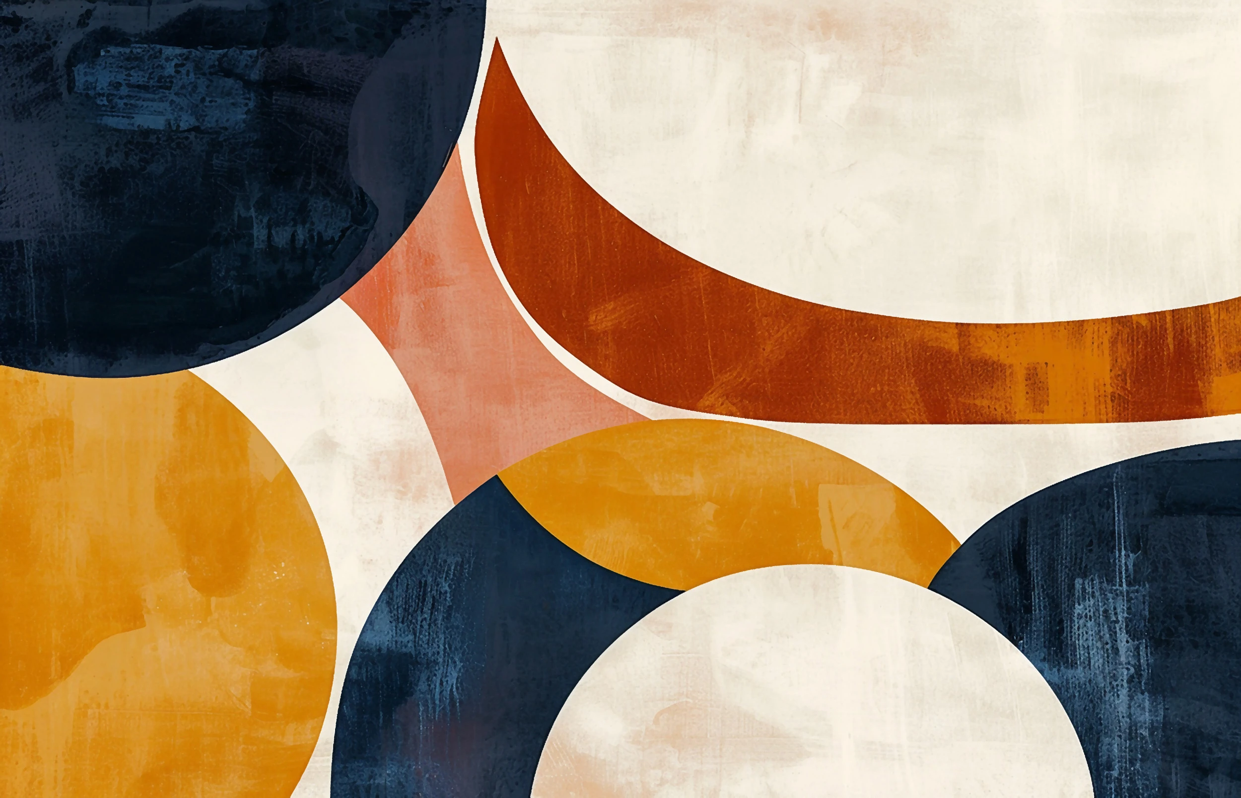 La palette chromatique de ce papier peint design joue sur des contrastes saisissants : le bleu profond marine dialogue avec des tons orangés chaleureux, tandis que l’ocre doré et le terracotta apportent une dimension terrestre et authentique. Ces nuances naturelles sont magnifiées par des touches de blanc cassé qui créent des espaces de respiration et accentuent la modernité du motif. L’aspect texture peinte visible sur chaque forme évoque la technique de l’aquarelle et confère à l’ensemble une dimension artisanale raffinée.