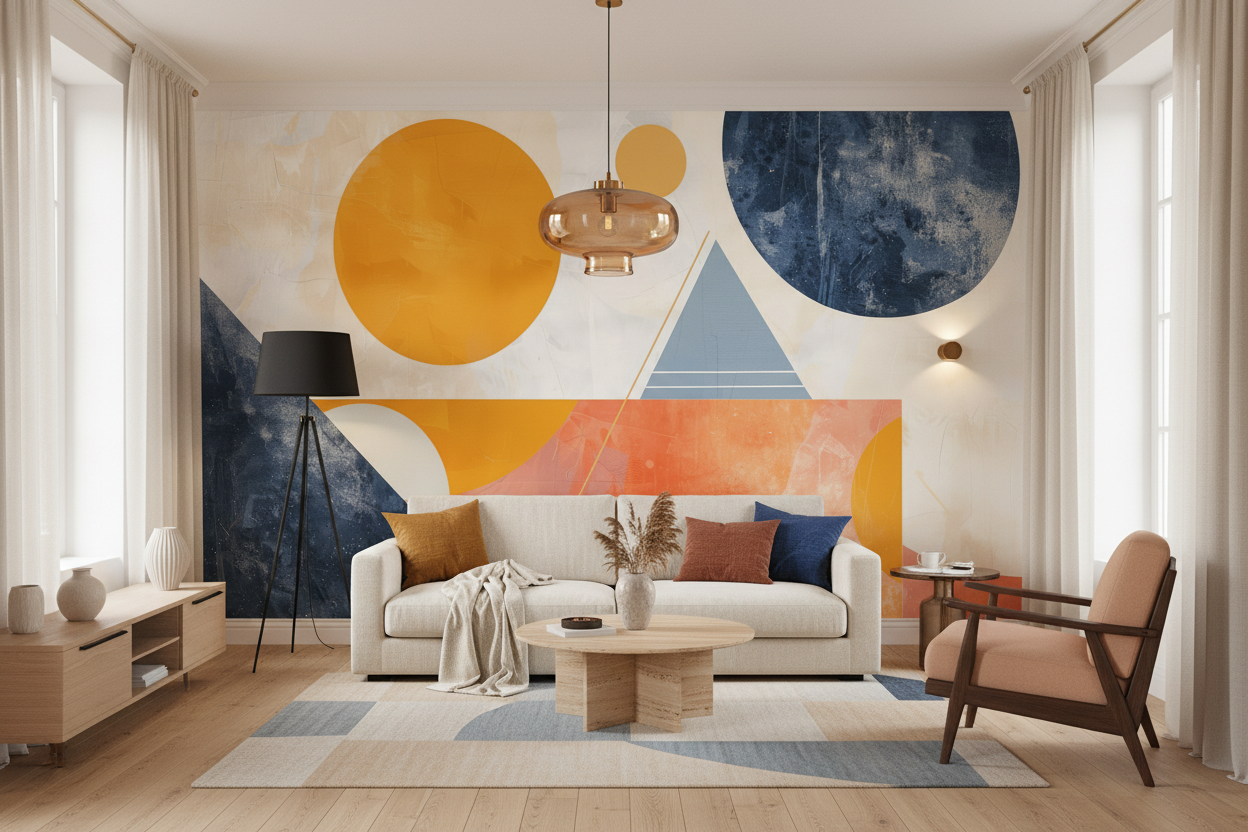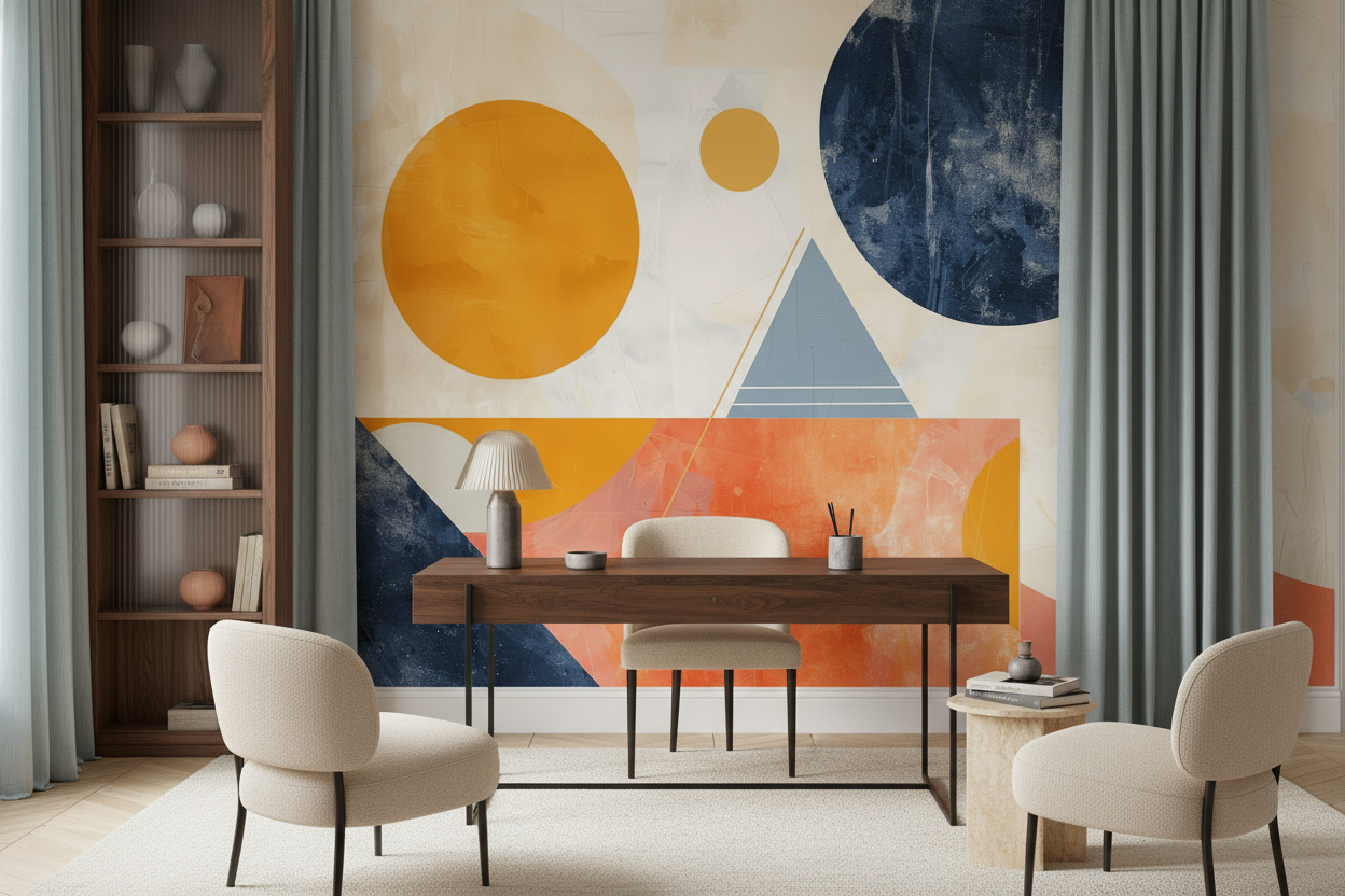 Ce papier peint design abstrait révèle une composition artistique d’une rare sophistication. Des cercles orange lumineux évoquent des soleils couchants, tandis qu’un triangle bleu gris apporte structure et modernité à l’ensemble. Les formes organiques corail aux reflets poudrés se mêlent harmonieusement à des éléments géométriques bleu marine, créant un dialogue captivant entre douceur et caractère. Cette fresque murale contemporaine s’inspire de l’art graphique scandinave et du mouvement Bauhaus, avec ses aplats de couleur aux textures subtilement patinées qui rappellent la peinture acrylique sur toile.