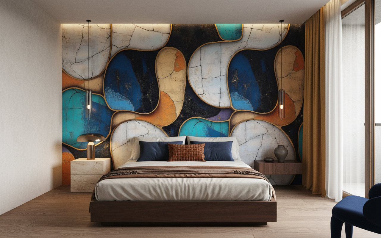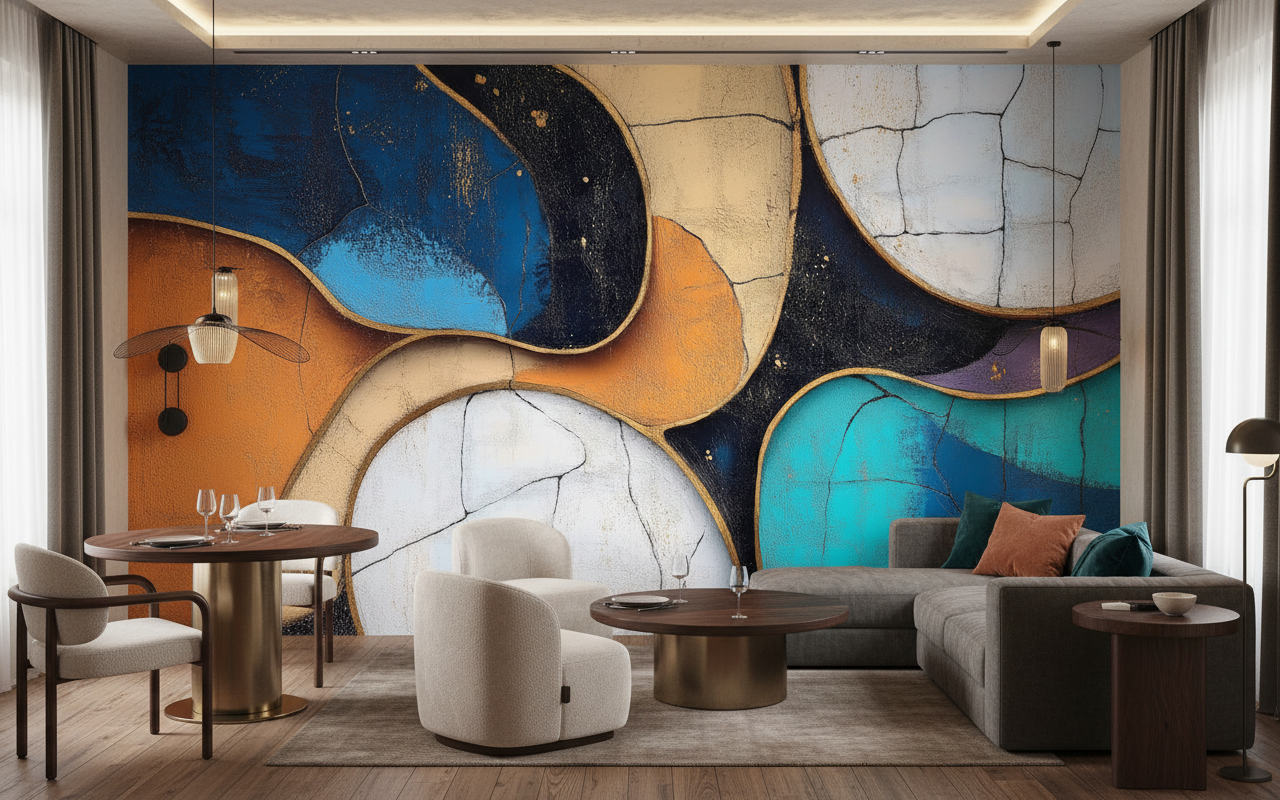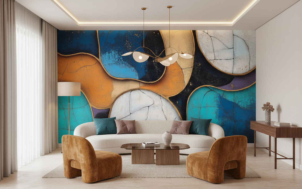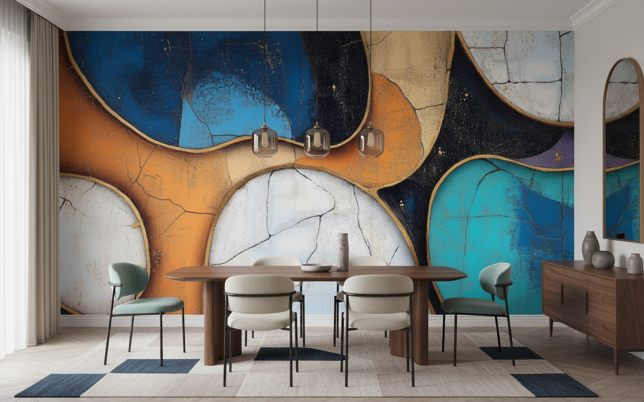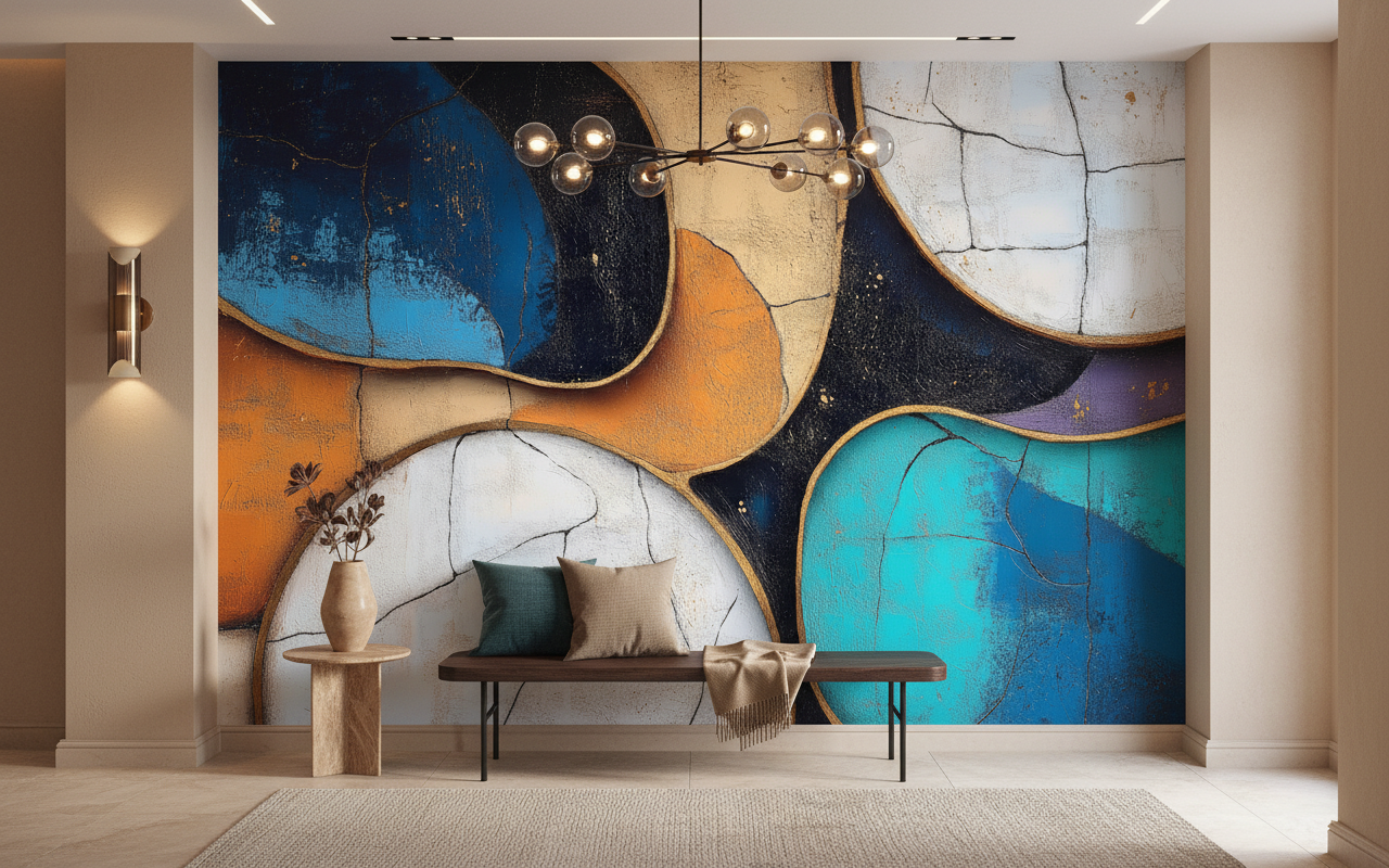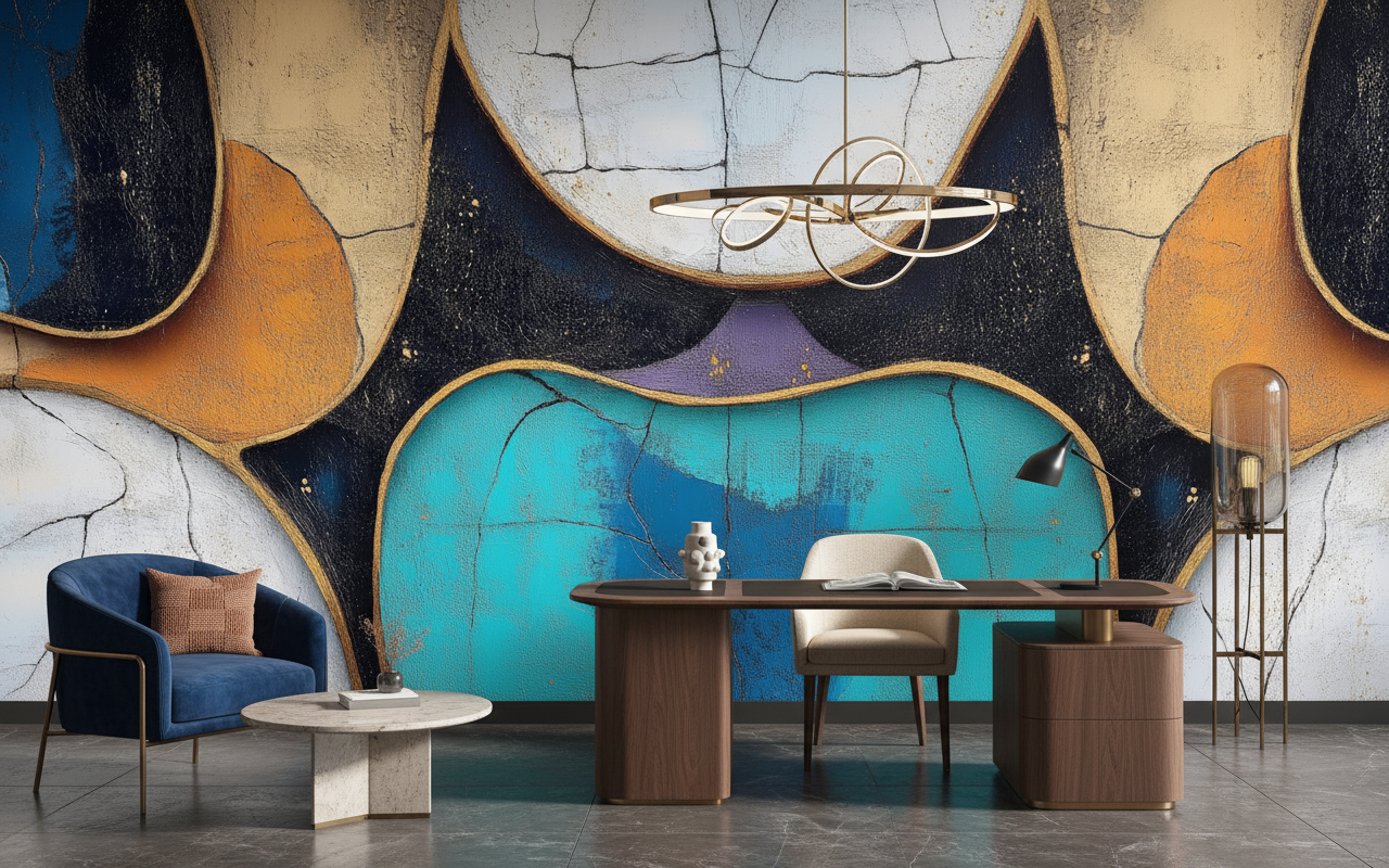 Associez cette décoration abstraite à du mobilier en bois naturel aux lignes épurées pour créer un contraste harmonieux. Les matières textiles en lin beige ou en velours bleu canard sublimeront les tonalités du papier peint. Des accessoires en laiton ou en cuivre résonneront parfaitement avec les contours dorés, tandis qu’un éclairage tamisé révélera toute la subtilité des nuances chromatiques.