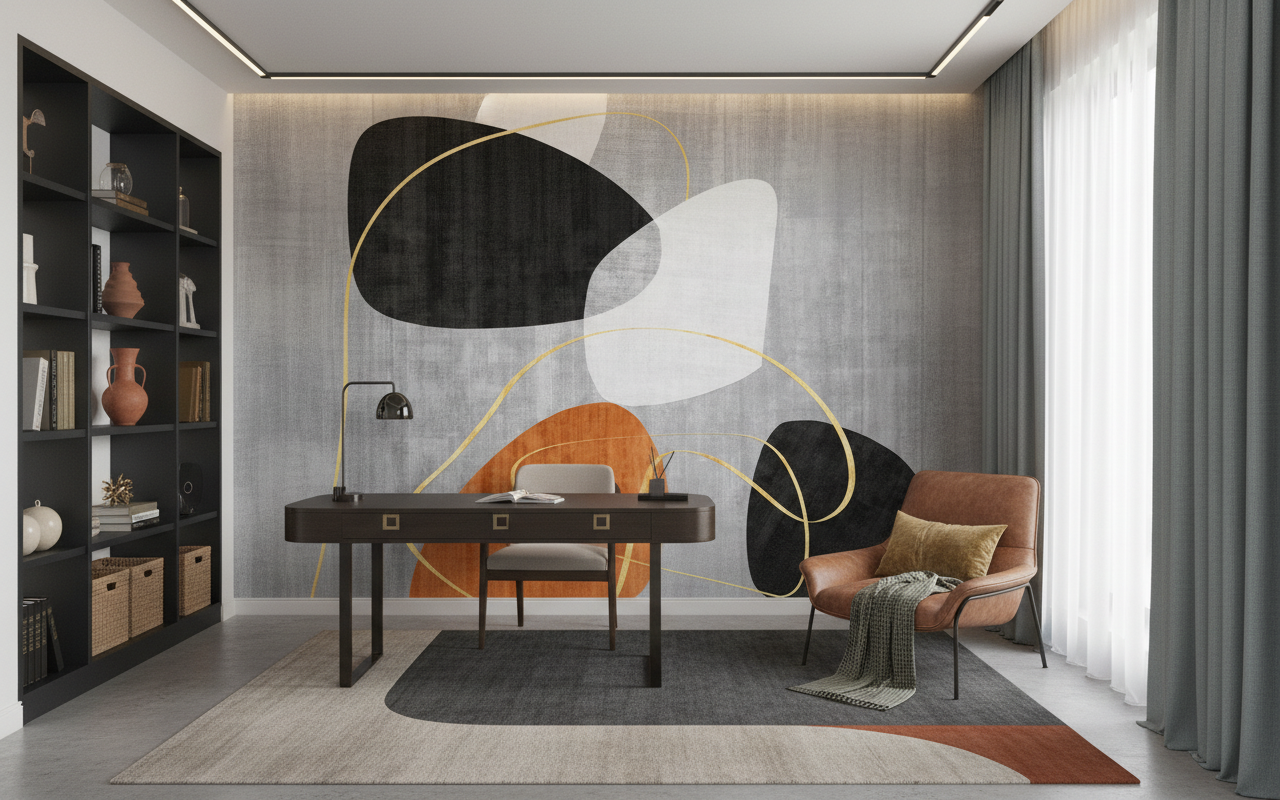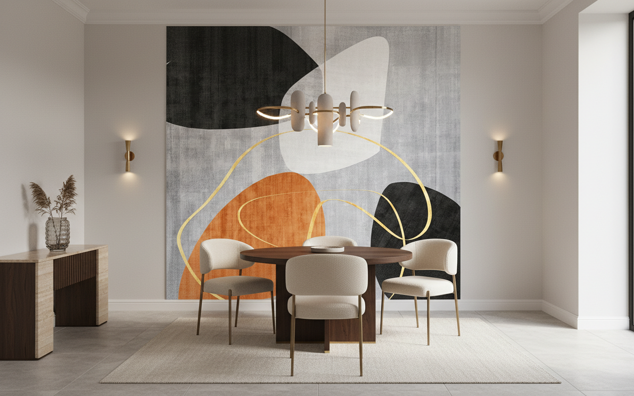 Parfaitement adapté pour habiller un mur de salon moderne, ce papier peint décoratif trouvera également sa place dans une chambre parentale en tête de lit, un bureau design ou encore un couloir que vous souhaitez métamorphoser en galerie d’art. Associez-le à du mobilier en bois clair – chêne ou frêne – pour créer un contraste chaleureux, ou à des éléments en laiton brossé qui feront écho aux cercles dorés du motif. Les textiles en lin naturel, les coussins dans les tons terre cuite ou ocre, et quelques accessoires céramique aux formes épurées complèteront harmonieusement cette ambiance scandinave-moderne.