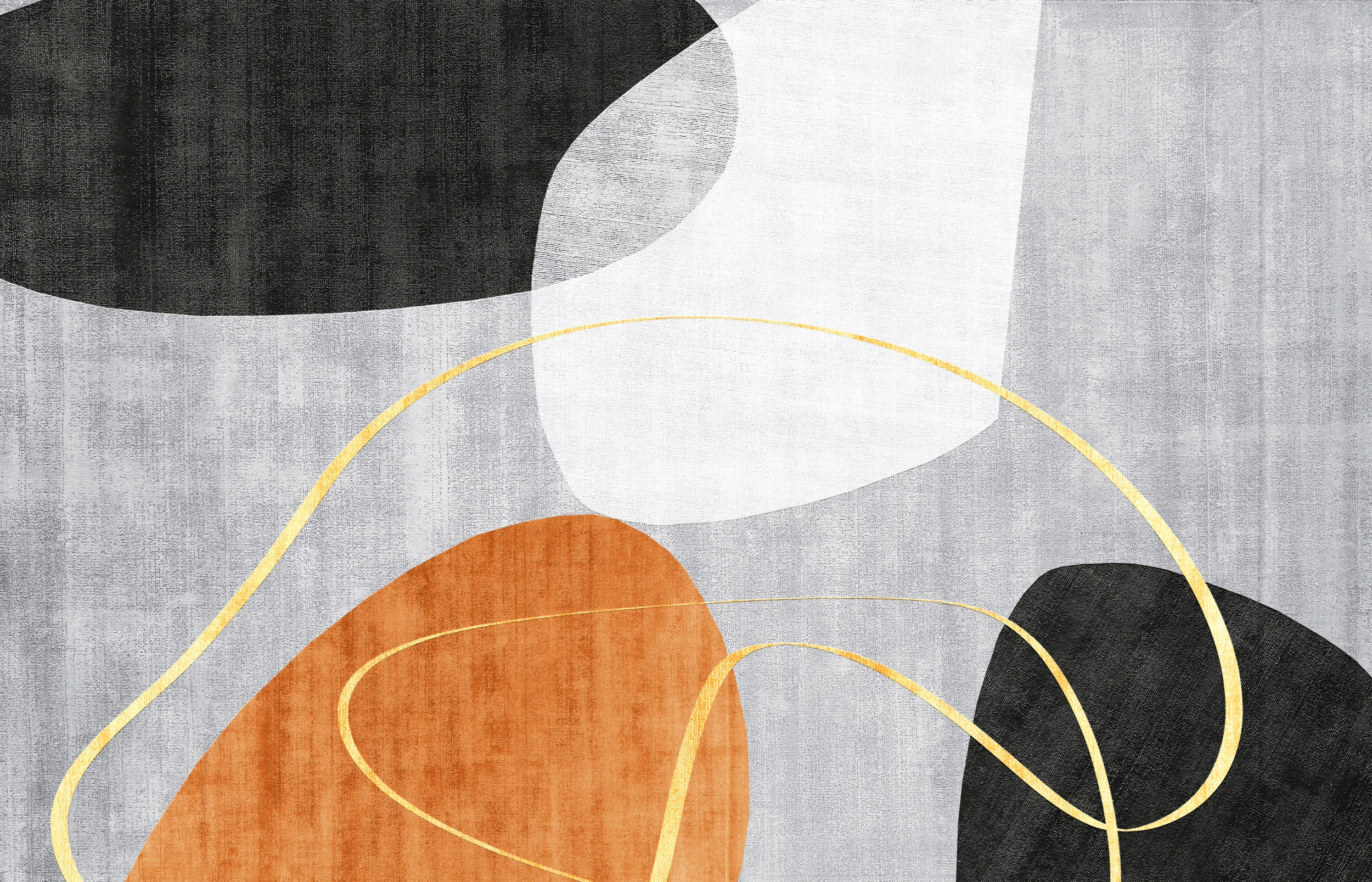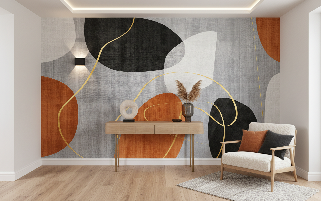 Ce papier peint contemporain révèle une composition artistique d’une rare élégance, orchestrée autour de formes organiques aux contours fluides. Les motifs géométriques abstraits s’entremêlent avec grâce : de généreux cercles dorés aux traits fins comme des filaments de lumière, des formes ovales d’un blanc nacré qui évoquent des galets polis par le temps, et des éléments triangulaires d’un orange terre de Sienne réchauffant l’ensemble. L’arrière-plan se pare de nuances grises texturées, créant un effet de matière sophistiqué qui rappelle le lin froissé ou la soie sauvage. Les tons noirs profonds apportent structure et caractère, tandis que les accents dorés captent et reflètent la lumière avec une délicatesse orfèvre.