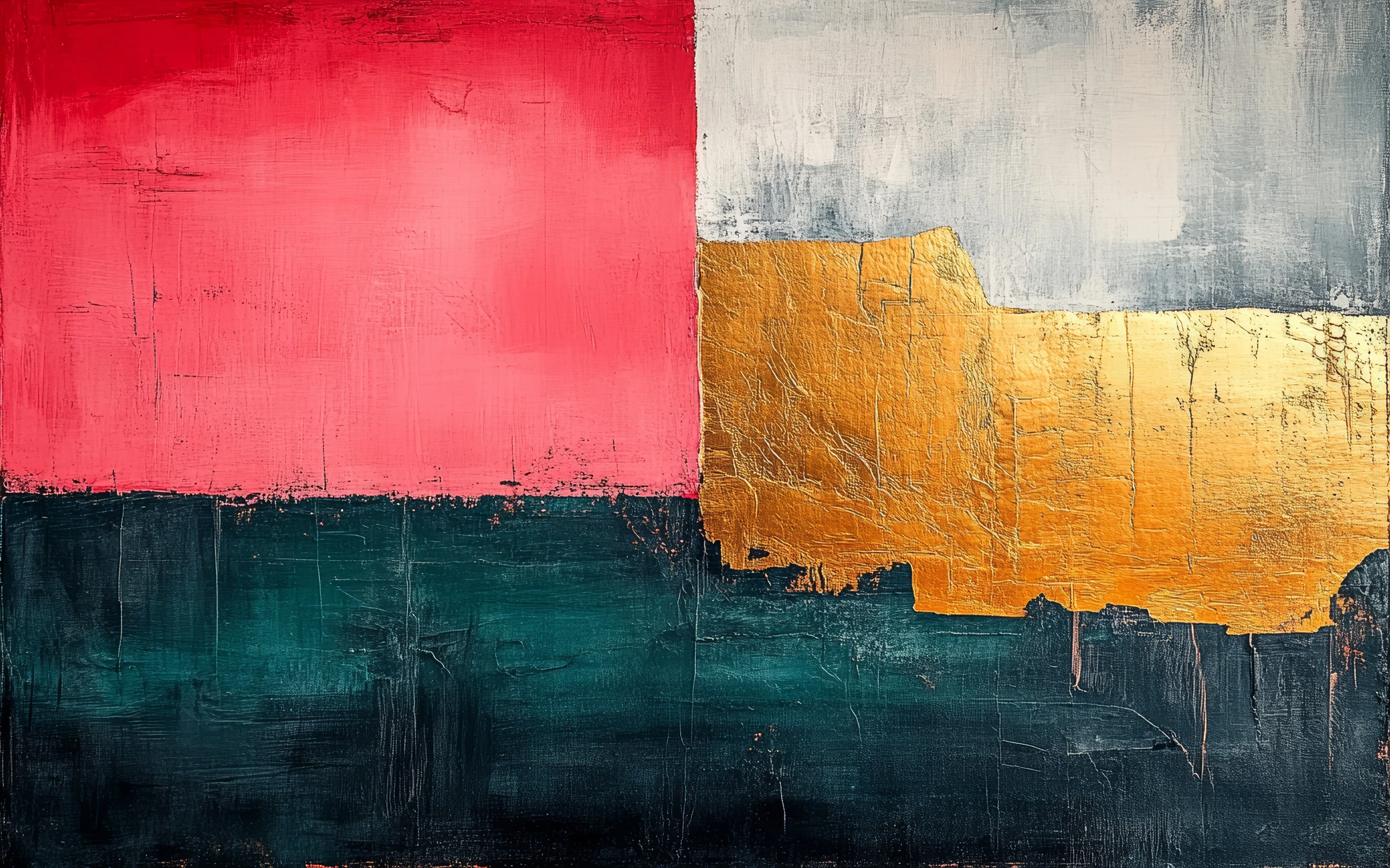 Ce papier peint contemporain révèle une composition artistique saisissante, où quatre blocs de couleurs intenses s’épanouissent dans une harmonie contrastée. Le rouge vermillon occupe fièrement le quart supérieur gauche, vibrant d’une énergie passionnée qui réveille les sens. À ses côtés, une zone blanc cassé nuancée de gris apporte une respiration contemplative, marquée par des traces texturées qui évoquent un ciel orageux. La partie centrale révèle un magnifique jaune doré et ocre aux reflets cuivrés, créant une sensation de chaleur solaire qui irradie dans l’espace. Enfin, la base se pare d’un bleu-vert profond aux accents marins, ancrant cette composition dans une stabilité rassurante.