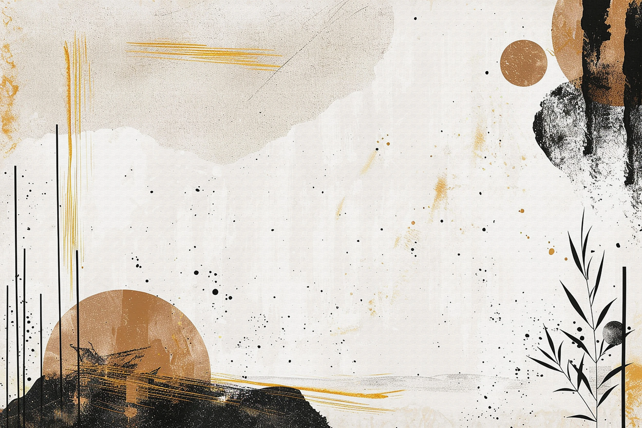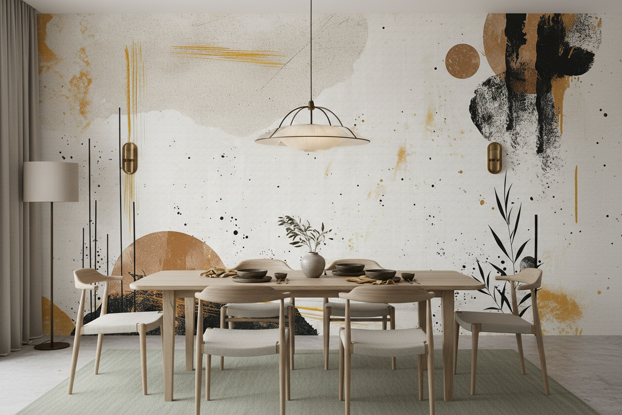 Ce papier peint moderne révèle un univers graphique d’une rare sophistication, mêlant subtilement formes géométriques et éléments organiques. La composition s’articule autour de cercles dorés aux textures granuleuses, évoquant des soleils couchants ou des lunes pleines, tandis que des silhouettes végétales stylisées émergent délicatement de l’ensemble. Les traits noirs expressifs traversent la toile tel un réseau de bambous ou de roseaux, créant une dynamique verticale saisissante.