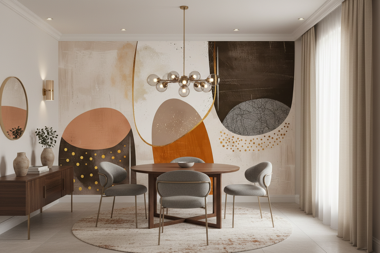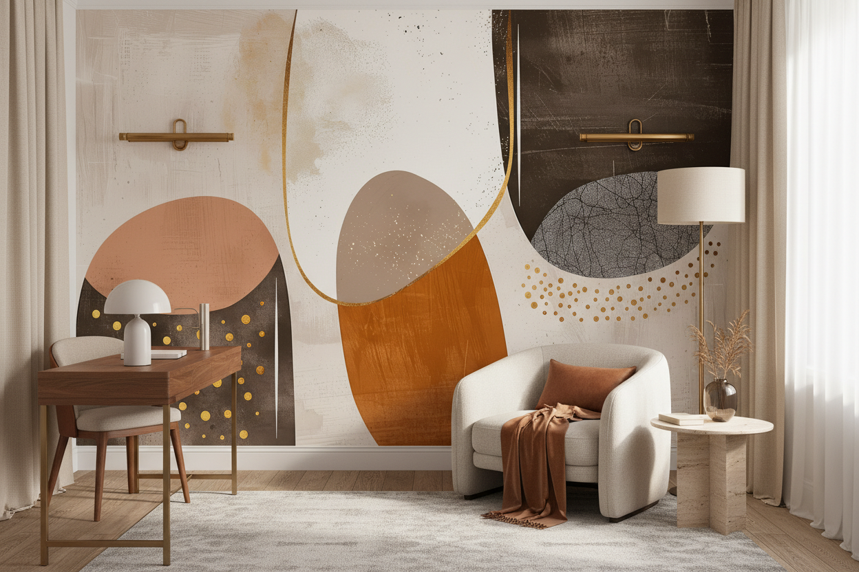Ce papier peint abstrait révèle une composition artistique d’une rare élégance, orchestrant un ballet de formes géométriques organiques dans une palette chromatique raffinée. Les tons terre de Sienne, les ocres chaleureux et les beiges poudrés se marient délicatement aux gris anthracite profonds, créant un contraste saisissant qui capte immédiatement le regard. Les motifs circulaires et ovales semblent flotter dans l’espace, tandis que des ponctuations dorées scintillent comme des étoiles, apportant une touche de préciosité à l’ensemble.