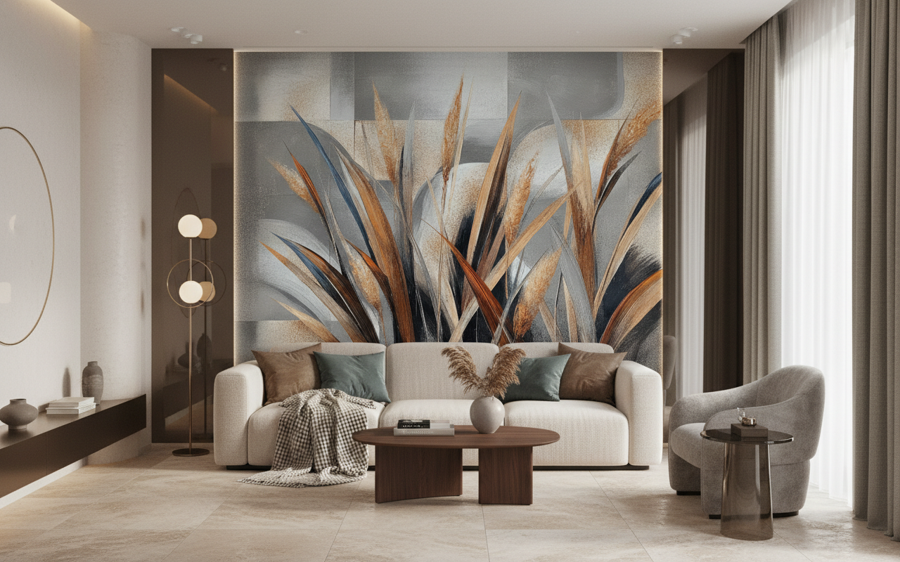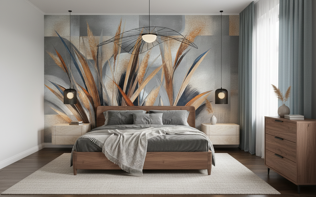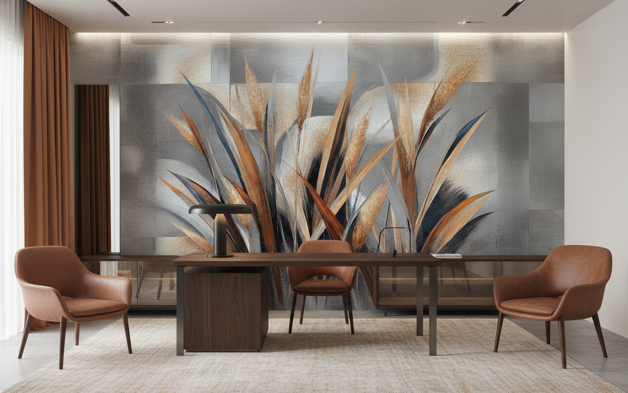 L’exécution artistique de ce papier peint design s’apparente à une technique mixte, mêlant l’expressivité de la peinture acrylique et la précision du dessin vectoriel. Chaque tige de graminée semble caressée par le vent, figée dans un instant de pure poésie visuelle. Les couleurs neutres dominent la composition, créant une palette apaisante où se mélangent harmonieusement les tons naturels et les nuances minérales.