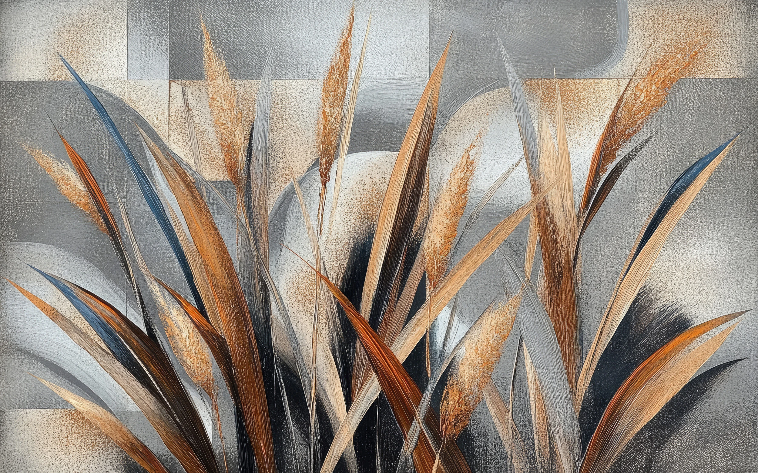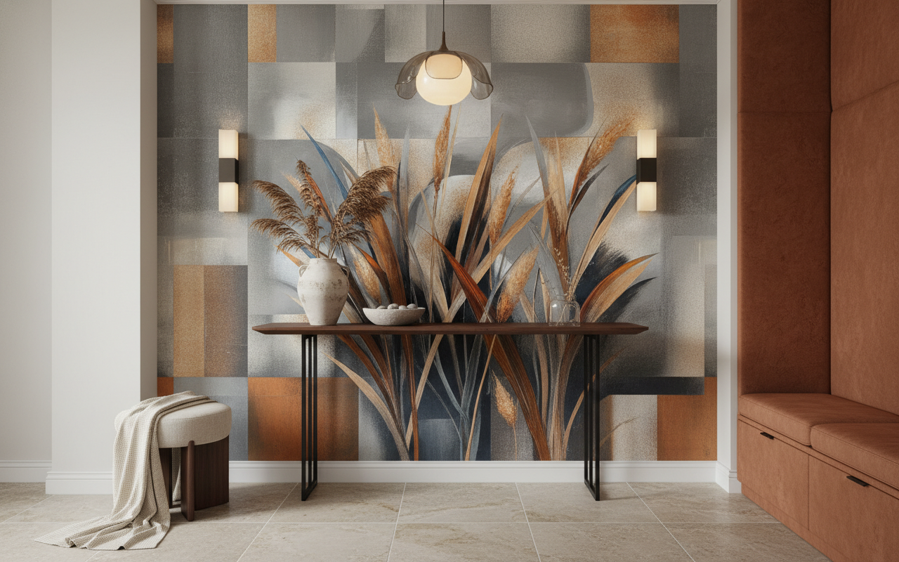Ce papier peint contemporain révèle un univers graphique d’une sophistication rare, orchestrant une symphonie végétale à travers des graminées stylisées aux silhouettes élancées. Les brins se déploient dans un élan gracieux, alternant entre des nuances de gris perle, de beige sable et d’ocre cuivré, ponctuées de subtiles touches bleu ardoise. L’arrière-plan se compose d’un patchwork géométrique aux tonalités poudrées, créant une profondeur texturée qui évoque la modernité d’un style contemporain raffiné.