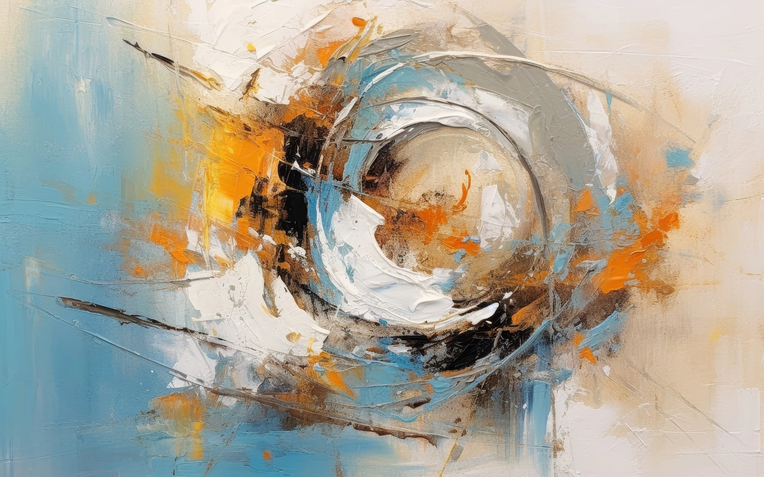 La palette chromatique sophistiquée marie subtilement les tons bleus océan aux oranges vibrants, ponctués de blancs lumineux et de bruns terreux. Ces nuances naturelles s’équilibrent parfaitement, créant un contraste saisissant entre la fraîcheur des bleus et la chaleur des orangés. Les touches de noir viennent structurer l’ensemble, apportant profondeur et caractère à cette composition abstraite moderne.