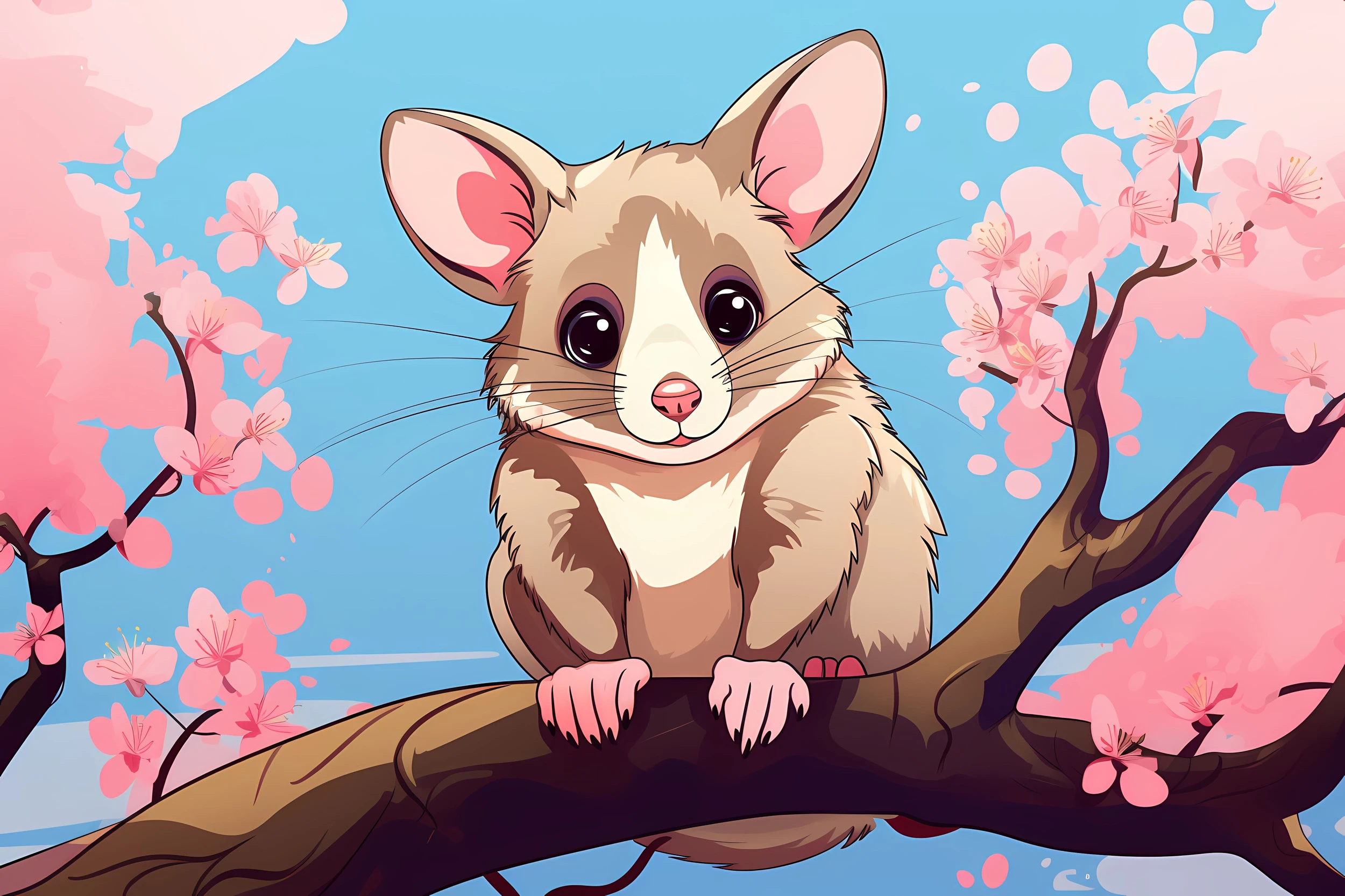 Au cœur de cette création artistique se dévoile un adorable petit mammifère aux grandes oreilles, perché avec délicatesse sur une branche de cerisier en fleurs. Son pelage aux tons chauds de beige et de caramel, rehaussé de blanc immaculé sur le poitrail et le museau, s’harmonise parfaitement avec les nuances rosées des fleurs de sakura. Le style graphique, proche de l’illustration contemporaine, mélange subtilement réalisme et douceur manga, créant un univers à la fois authentique et poétique.