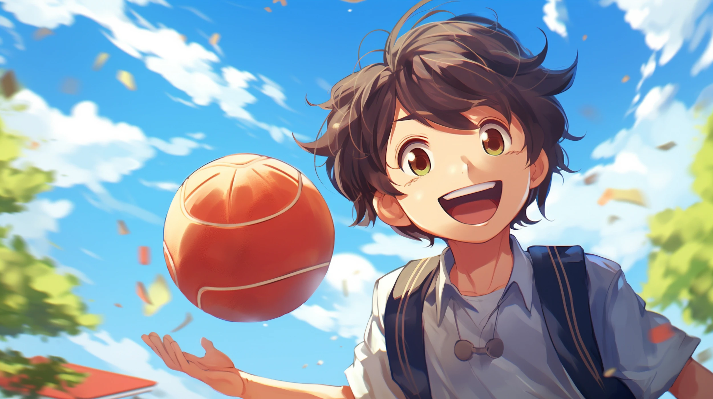 Ce papier peint style manga dévoile le portrait touchant d’un jeune homme aux traits expressifs, capturé dans un moment de pure félicité. Ses cheveux bruns ébouriffés dansent sous une brise imaginaire tandis qu’il jongle avec grâce avec un ballon de basket orange éclatant. L’illustration, réalisée dans un style anime moderne, conjugue parfaitement réalisme et stylisation artistique, créant une œuvre d’une fraîcheur saisissante. Le ciel bleu azur parsemé de nuages cotonneux forme un arrière-plan lumineux, ponctué de feuillages verts qui apportent une dimension naturelle et apaisante à l’ensemble.