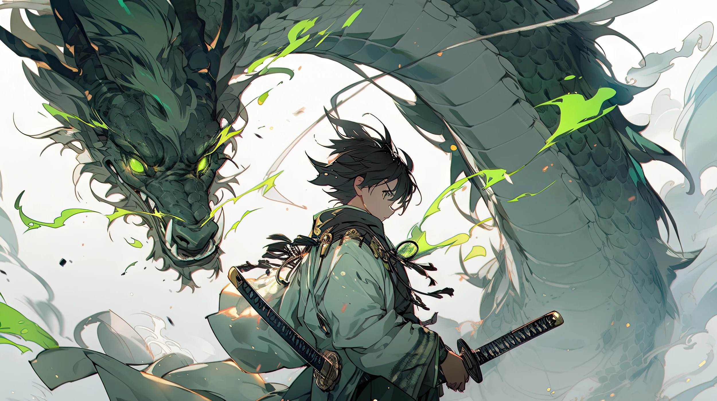 Papier peint anime samouraï et dragon vert mystique épique