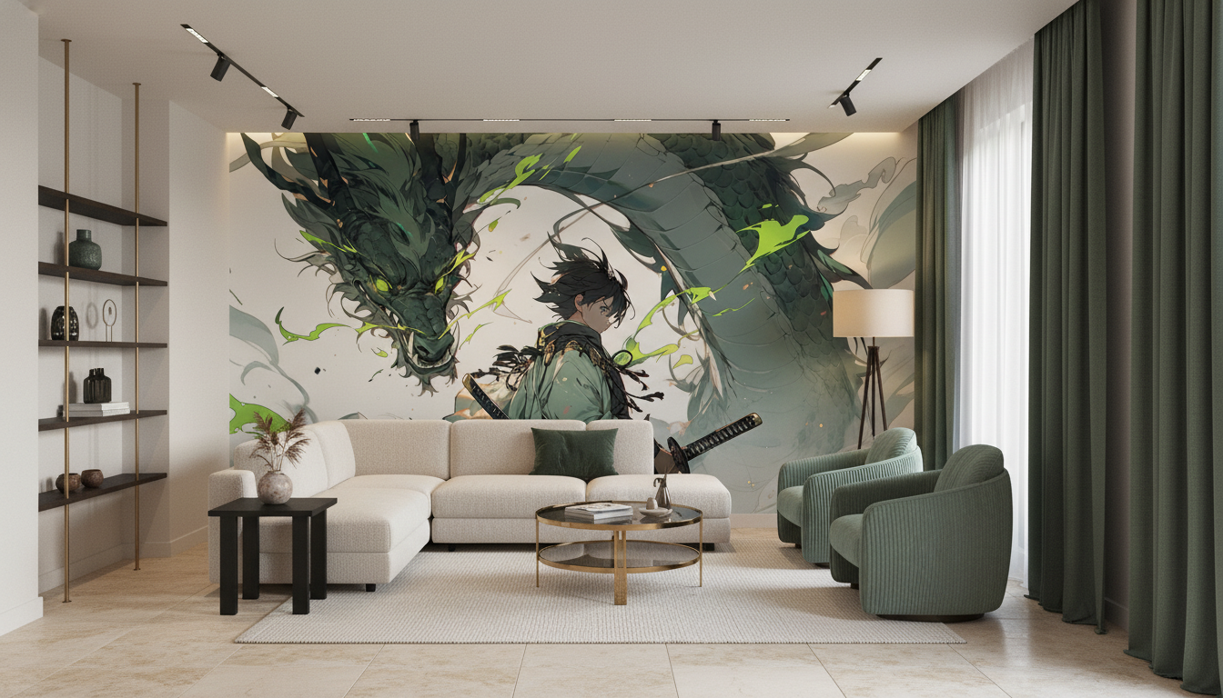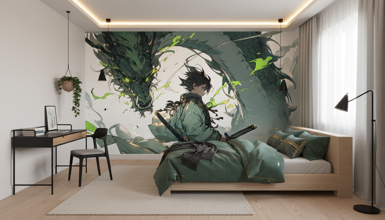 Ce papier peint anime trouve sa place idéale dans un bureau créatif, une salle de jeux ou une chambre d’adolescent passionné de culture japonaise. Dans un salon contemporain, il constitue un mur d’accent spectaculaire qui dialogue harmonieusement avec du mobilier en bois sombre, des coussins en lin naturel et des accessoires en cuivre brossé. Pour sublimer cette décoration style japonisant, privilégiez des matières brutes comme le bambou, l’ardoise ou le métal oxydé, et complétez avec des plantes vertes aux feuillages graphiques.