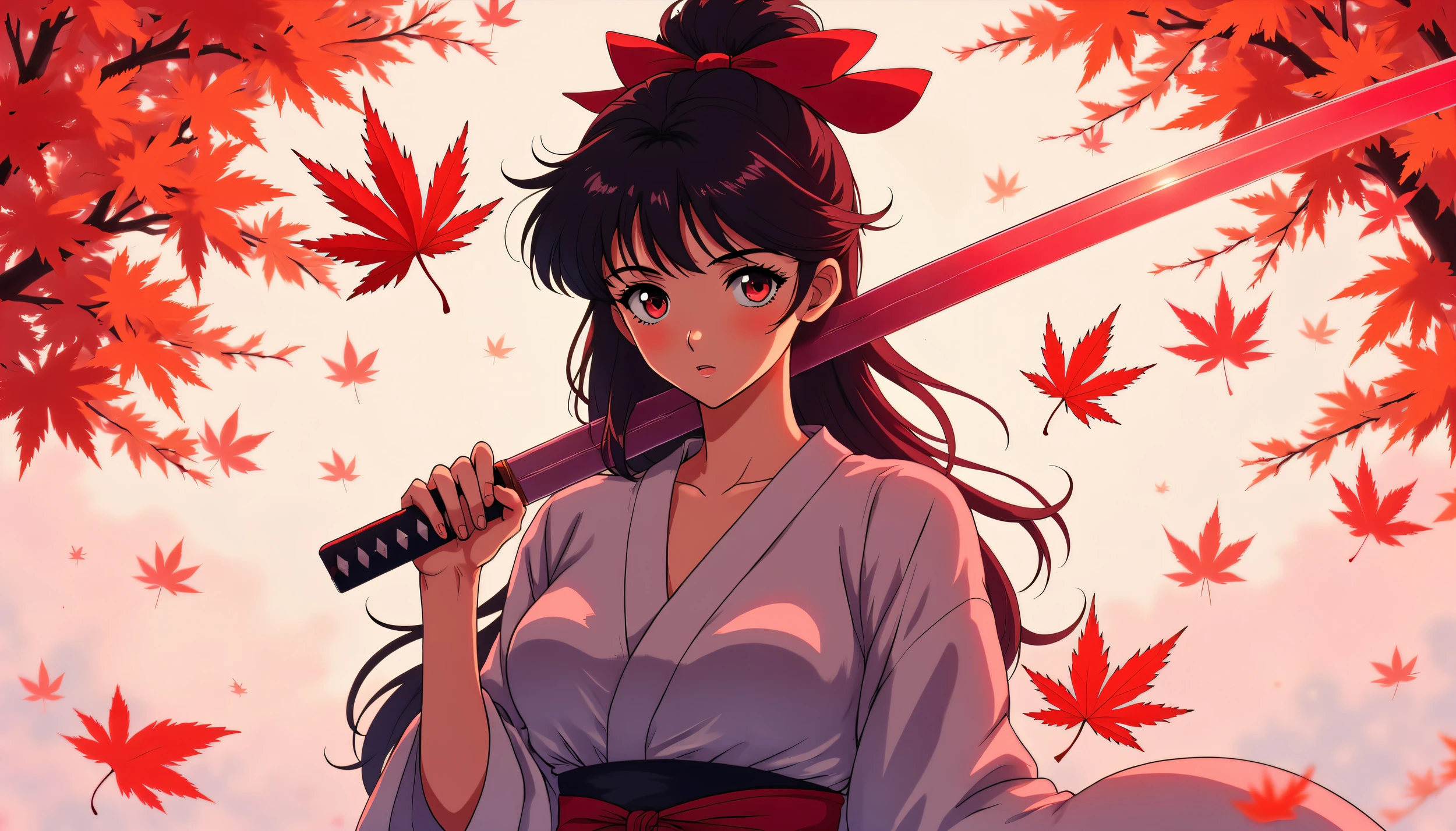 Ce papier peint manga d’exception révèle le portrait saisissant d’une guerrière aux yeux rouge carmin, dont la beauté mélancolique transcende l’ordinaire. Son katana repose délicatement sur son épaule, tandis que sa chevelure noire cascadante contraste avec le ruban rouge qui orne sa tête. Vêtue d’un kimono aux tons roses poudrés et violacés, elle semble émerger d’un rêve automnal où dansent les feuilles d’érable rouge dans un ballet aérien fascinant.