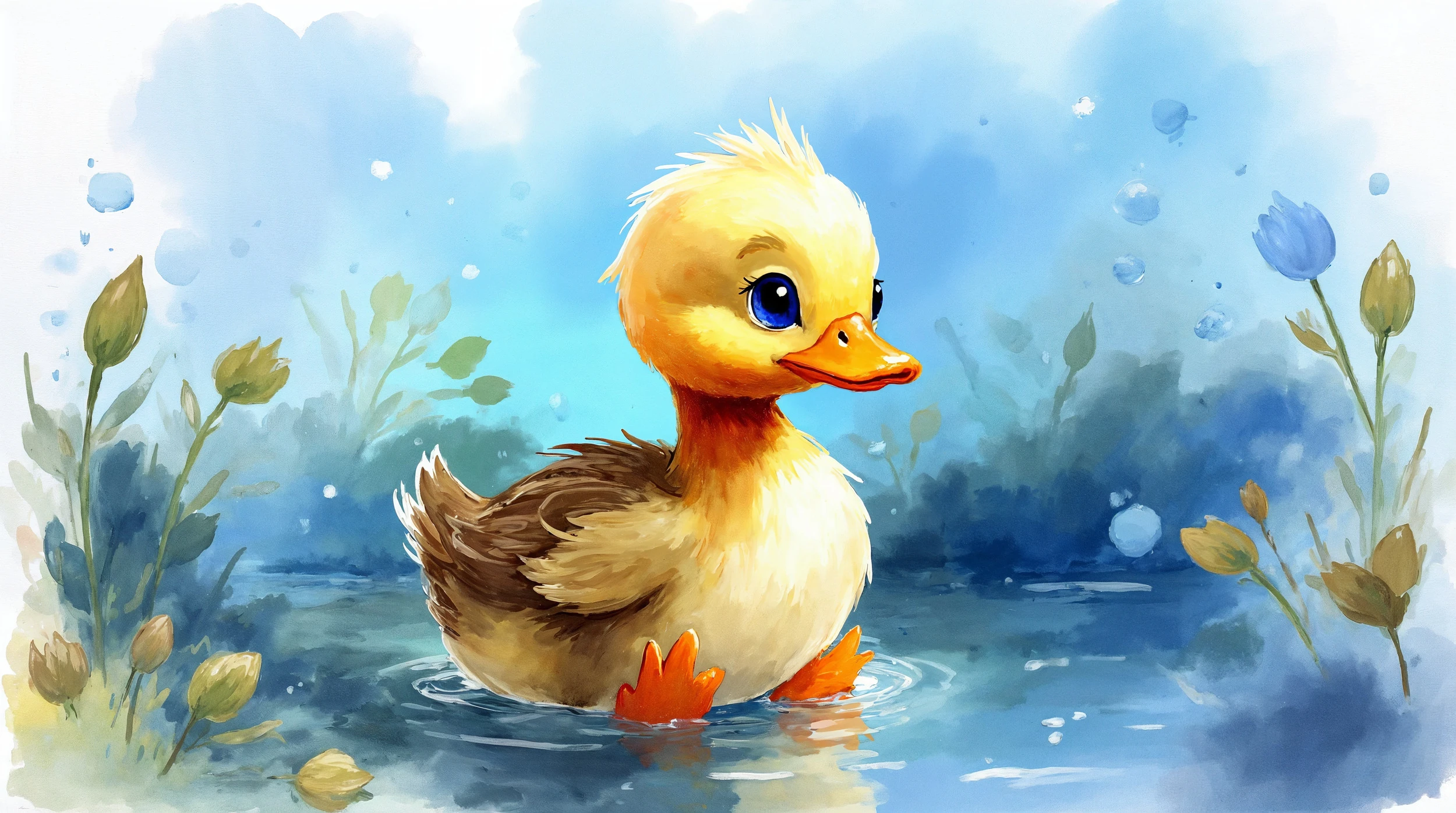 Ce papier peint aquarelle enfantine dévoile un adorable caneton aux plumes dorées, baignant paisiblement dans les eaux cristallines d’un étang enchanteur. L’illustration, réalisée dans un style aquarelle artistique, capture toute la tendresse de ce petit personnage aux grands yeux bleus malicieux et au duvet soyeux nuancé d’or et d’ambre. Les tons bleus profonds de l’eau se mêlent harmonieusement aux nuances aqua et turquoise, créant un dégradé naturel qui évoque la sérénité d’un matin au bord de l’eau.