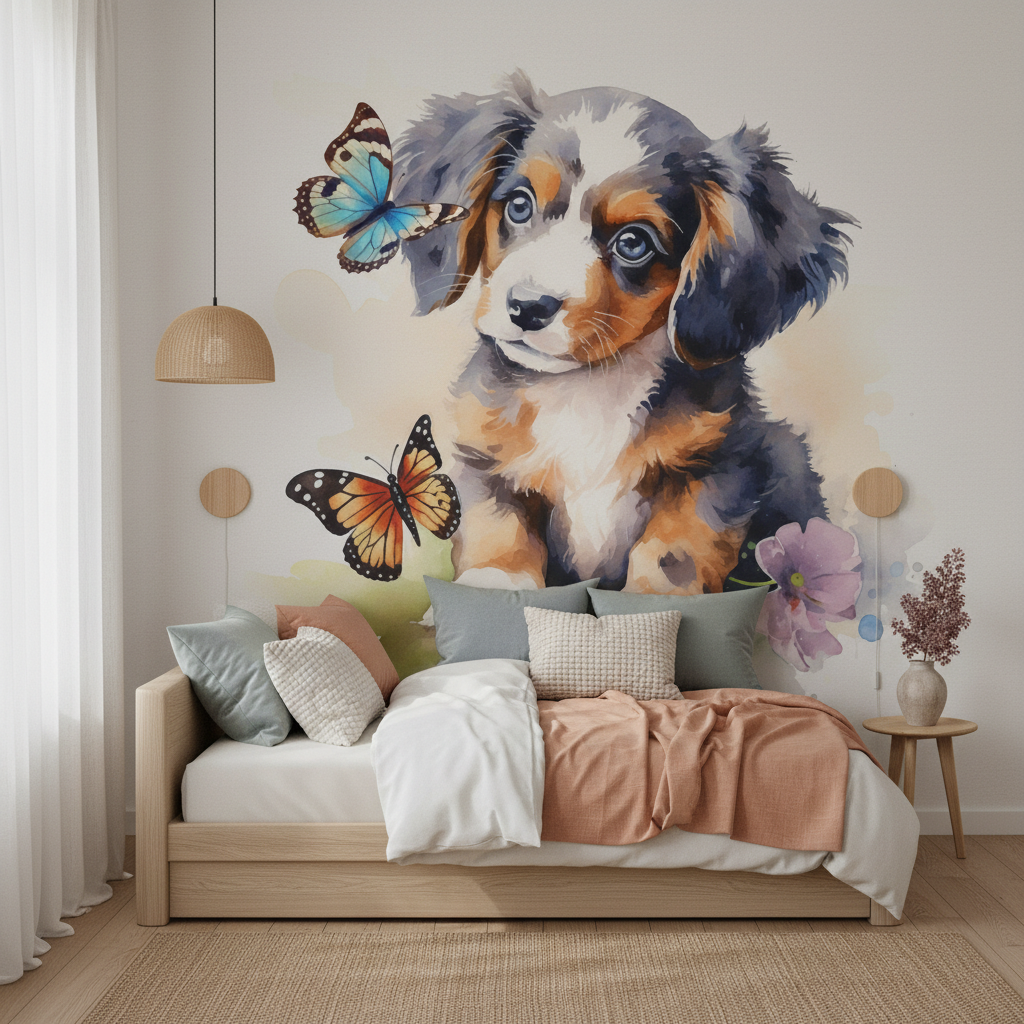 Cette illustration aquarelle magnifiquement réalisée met en scène un jeune chien aux couleurs chatoyantes – noir, blanc et roux – dont le regard malicieux et attendrissant capte immédiatement l’attention. Les tons aquarellés se mélangent harmonieusement dans des nuances de bleu gris, orange cuivré et blanc nacré, créant un effet pictural d’une délicatesse remarquable. Deux papillons colorés – l’un aux ailes turquoise et l’autre aux teintes orange vif – virevoltent gracieusement autour du petit animal, tandis qu’une fleur violette délicate complète cette composition florale et animalière. Le style aquarelle moderne révèle des pinceaux fluides et des éclaboussures artistiques qui confèrent à l’ensemble une authenticité picturale saisissante.