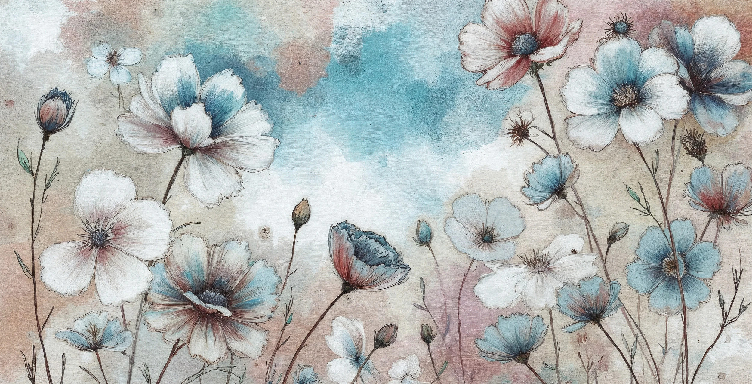La technique de l’aquarelle délicate confère à ce papier peint floral une douceur incomparable. Les contours finement tracés à l’encre révèlent chaque détail botanique avec une précision d’illustration naturaliste, tandis que les lavis colorés apportent cette transparence si caractéristique de l’art aquarellé. Le fond nuageux aux teintes pastel évoque un ciel d’été où se mêlent blanc, bleu tendre et rose poudrée, créant une profondeur atmosphérique remarquable.