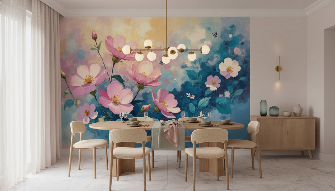Laissez-vous envoûter par cette symphonie florale où les fleurs roses dansent dans un ballet aquarellé aux nuances célestes, transformant votre intérieur en un jardin suspendu entre rêve et réalité.