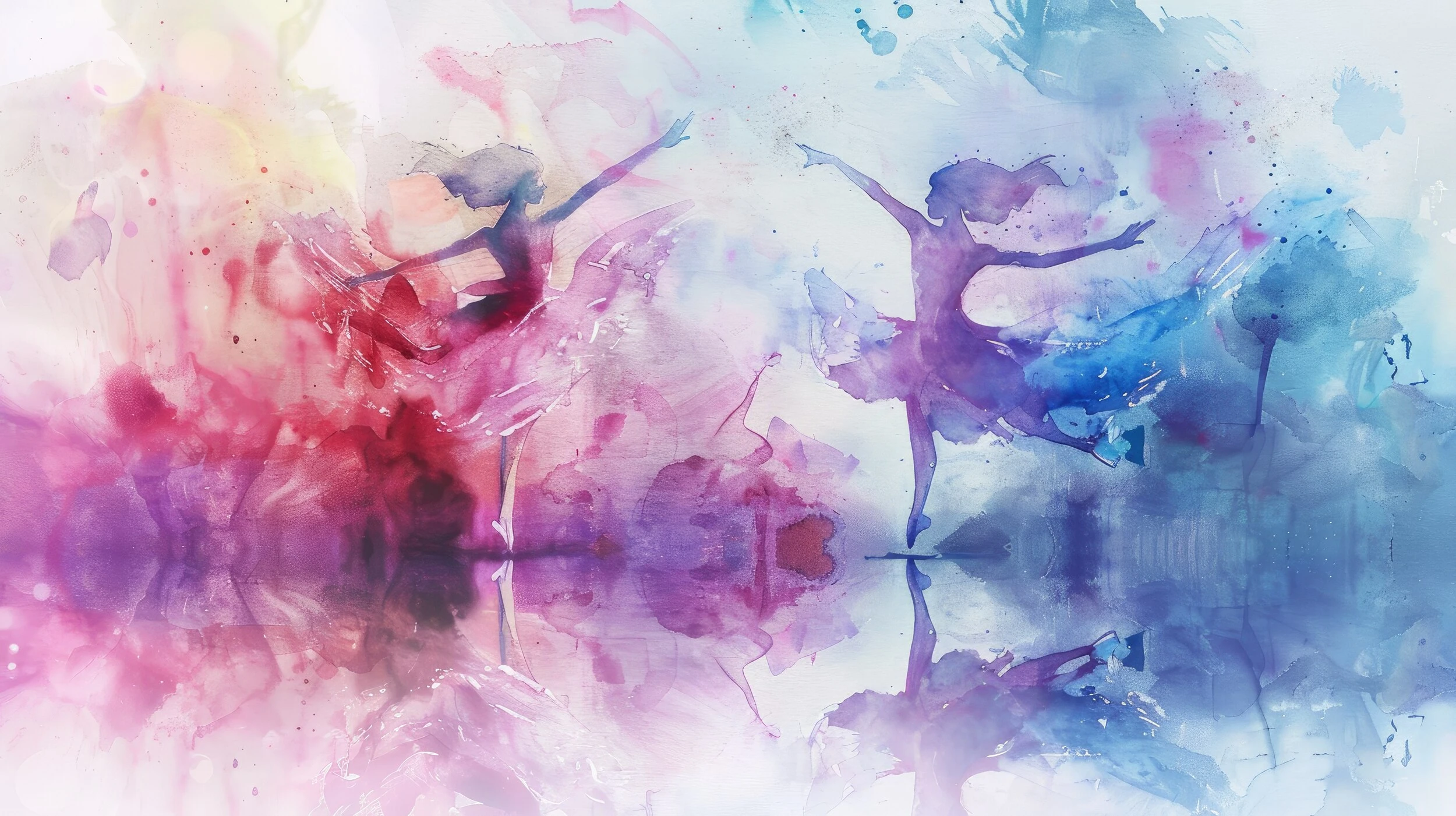 Ce papier peint artistique aquarelle révèle une composition abstraite d’une beauté saisissante, où les silhouettes de danseurs émergent gracieusement d’un tourbillon de couleurs fluides. Les teintes roses pastel et tons corail de la partie gauche fusionnent harmonieusement avec les nuances bleues profondes et violettes intenses qui dominent la droite de la composition. Cette technique d’aquarelle moderne crée des effets de transparence et de superposition qui donnent vie aux personnages, leurs corps semblant flotter dans un univers onirique aux dégradés subtils.