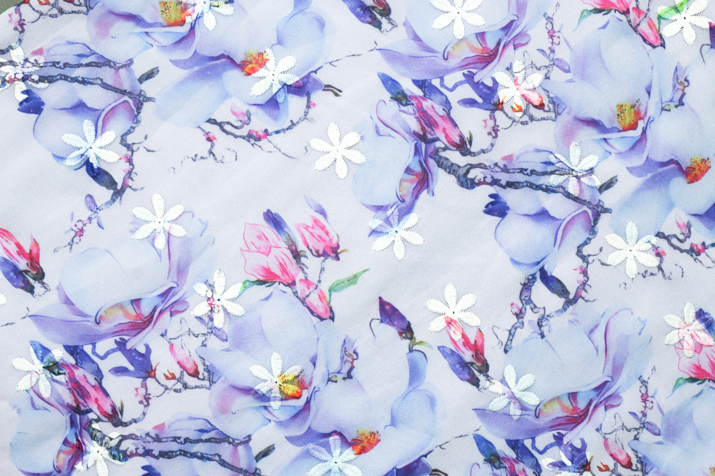La palette chromatique privilégie la douceur des tons poudrés : un fond blanc nacré accueille des bleus pervenche, des mauves délicats et des roses tendres. Quelques touches de vert jade viennent ponctuer cette composition florale, tandis que des accents corail apportent une note de chaleur subtile à l’ensemble.