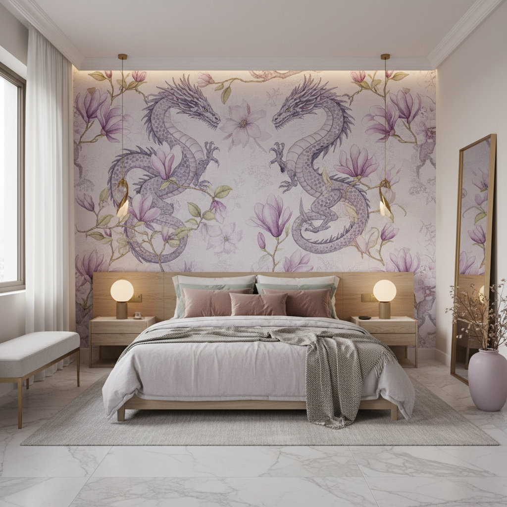 Plongez dans un univers zen et féérique avec ce papier peint aquarelle. Dragons stylisés et fleurs délicates aux teintes violet pastel. Une décoration murale sur mesure pour une ambiance apaisante et unique.