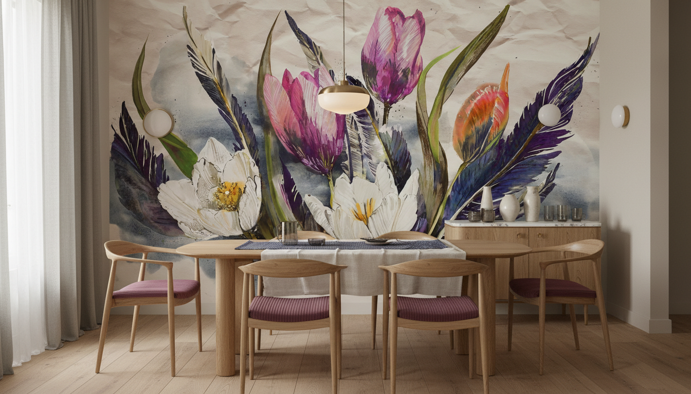 Ce papier peint floral artistique révèle une composition botanique d’une rare élégance, mêlant tulipes roses aux nuances magenta et blanches, fleurs blanches au cœur doré éclatant, et touches d’orange corail. Les plumes bleues et violettes viennent ponctuer cette symphonie végétale d’une note poétique inattendue, créant un contraste saisissant avec les feuillages verts aux lignes gracieuses.