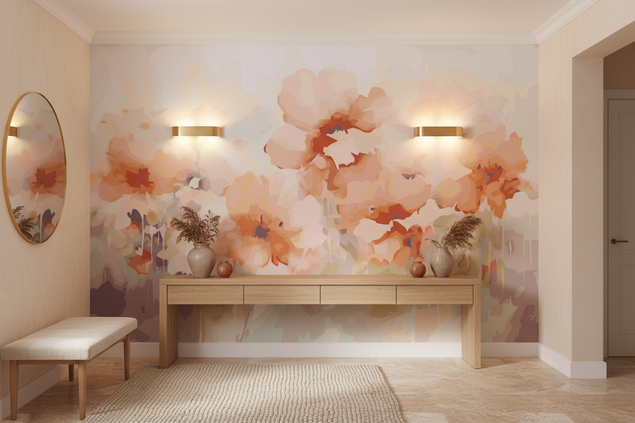 Parfait pour sublimer une chambre parentale, ce papier peint aquarelle s’épanouira également dans un salon cosy ou un bureau où la créativité a besoin d’être stimulée. Pour magnifier son effet, associez-le à du mobilier en bois naturel aux finitions douces, des textiles en lin écru ou velours rose poudré. Les accessoires en laiton brossé ou cuivre rosé viendront echo aux nuances chaudes des fleurs, tandis que des coussins dans les tons terracotta et sage prolongeront l’harmonie chromatique. Ce revêtement mural artistique se marie à merveille avec un style déco bohème chic ou scandinave moderne, apportant cette touche de féminité et d’élégance qui fait toute la différence.