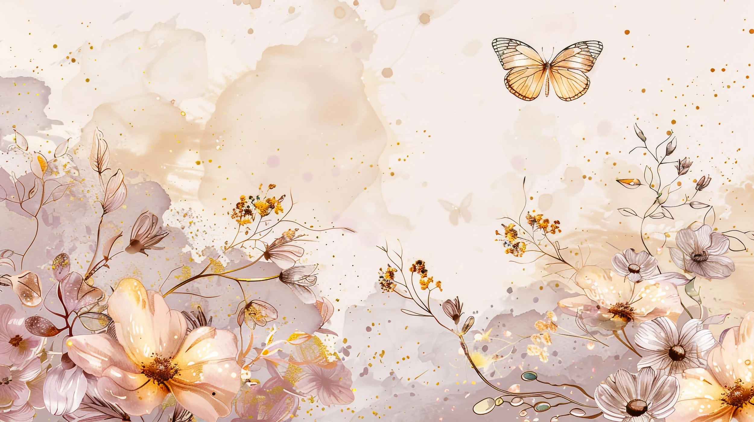 Ce papier peint floral d’exception révèle un univers délicat aux tons poudrés et lumineux, orchestré autour de fleurs aquarellées aux pétales translucides. Les cosmos délicats et les marguerites stylisées se déploient avec grâce sur un fond vaporeux aux nuances beige rosé et blanc cassé. Un papillon doré aux ailes finement nervurées vient ponctuer cette composition florale, apportant une touche de mouvement et de poésie. Les branchages sinueux aux tons ocre et terre de sienne structurent l’ensemble, créant un réseau organique qui guide naturellement le regard.