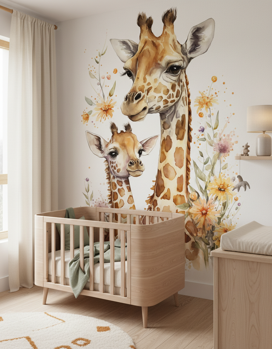 Ce papier peint girafe aquarelle révèle un duo touchant composé d’une majestueuse girafe adulte et de son adorable girafon, délicatement peints dans un style aquarelle artistique d’une finesse remarquable. Les taches dorées et ocre de leur pelage se fondent harmonieusement avec des nuances de beige chaleureux et de brun caramel, créant un camaïeu naturel d’une douceur infinie. Leurs grands yeux expressifs, bordés de longs cils, transmettent une émotion palpable qui transforme instantanément l’atmosphère de votre intérieur. Des fleurs sauvages aux pétales orangés et violets s’épanouissent gracieusement autour des silhouettes, accompagnées de feuillages verts tendres et de délicates éclaboussures colorées qui apportent une dimension poétique à l’ensemble.