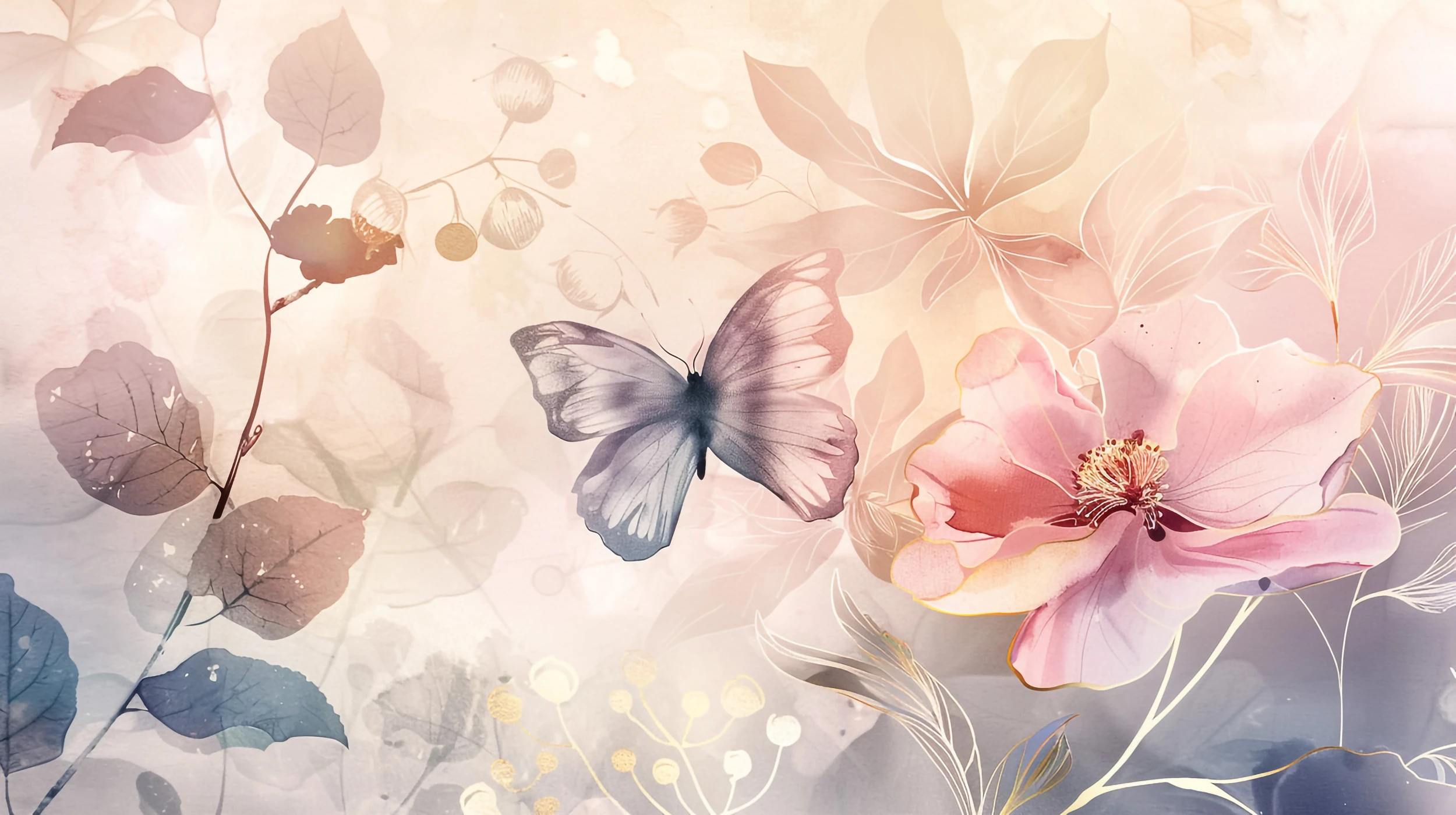 Ce papier peint fleuri dévoile un univers onirique où la nature délicate s’épanouit dans toute sa splendeur. Des fleurs roses poudrées aux pétales translucides côtoient des feuillages brunis et des branches graciles, créant une composition végétale d’une rare élégance. Un papillon aux ailes irisées, véritable joyau de cette création, plane majestueusement au cœur de cette symphonie botanique.