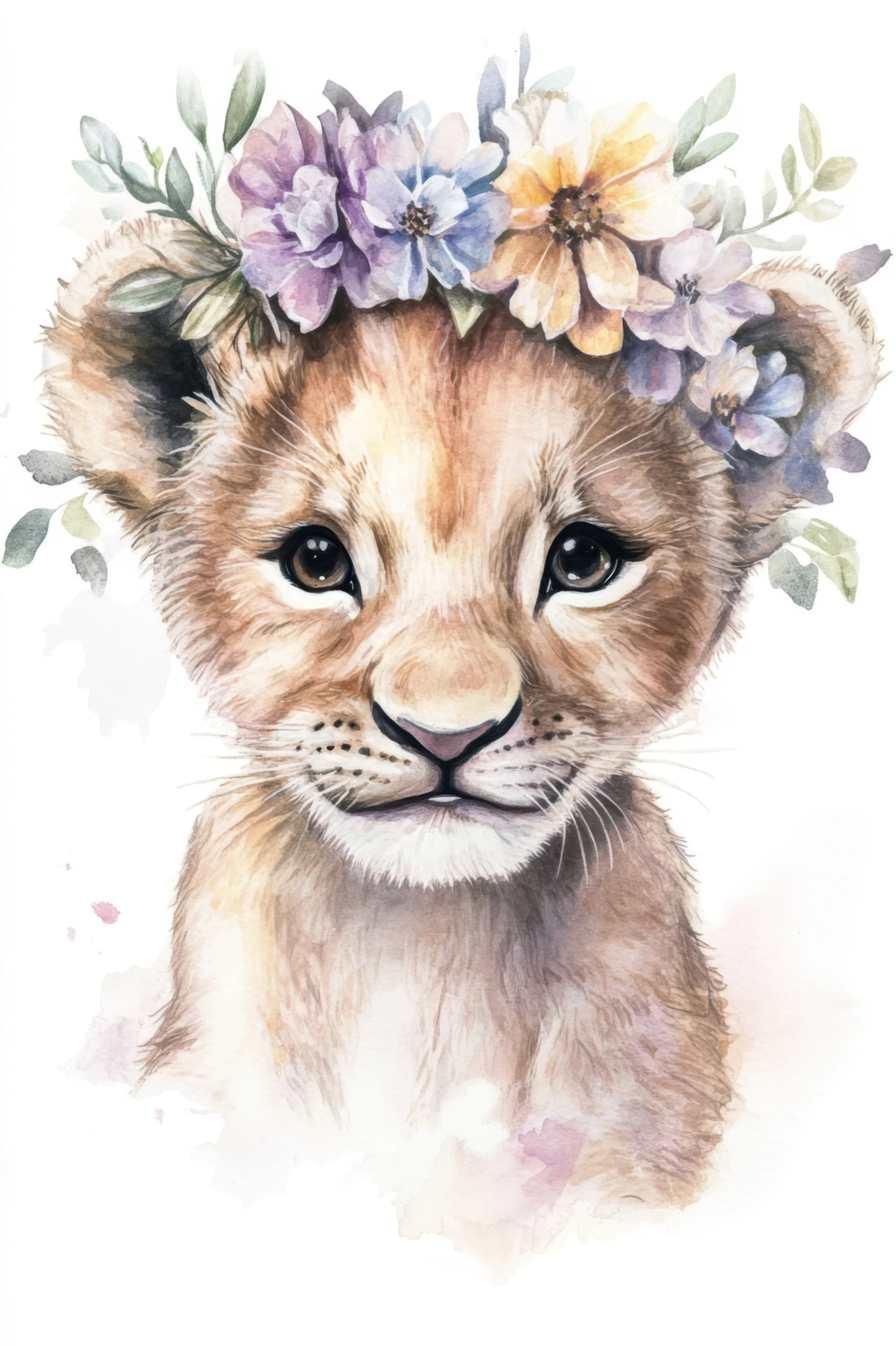 Ce papier peint aquarelle révèle le portrait touchant d’un lionceau aux yeux expressifs, couronné d’une délicate parure de fleurs pastel. L’artiste a su capturer avec une maîtrise remarquable cette dualité entre force naturelle et douceur enfantine. Les tons chauds ocre et beige du pelage se marient harmonieusement avec les nuances violettes, bleues et pêche des corolles délicates. Cette illustration à l’aquarelle dévoile un rendu pictural d’une finesse exceptionnelle, où chaque coup de pinceau semble caresser le papier avec une tendresse infinie.