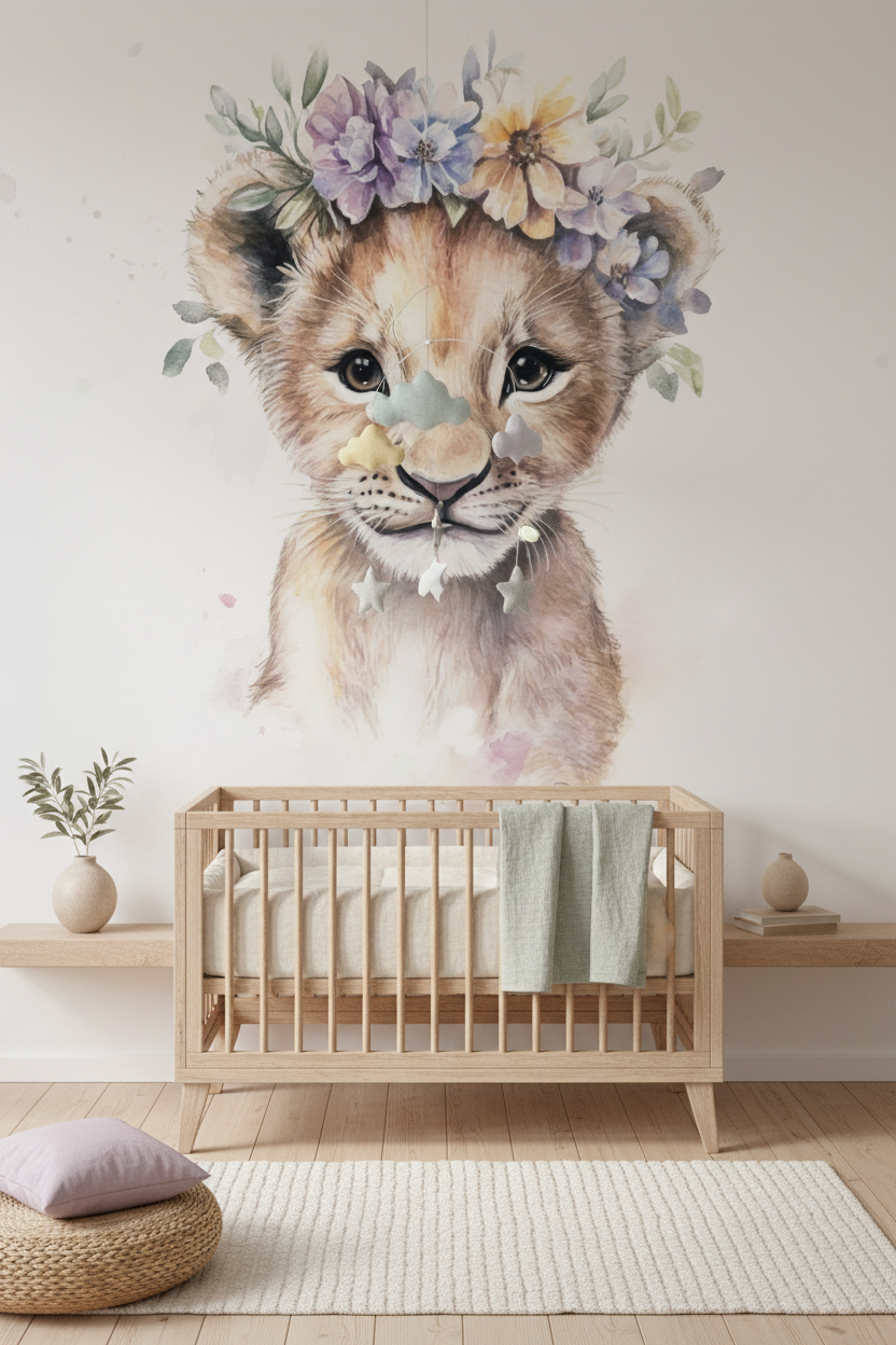 Les fleurs romantiques – pensées, anémones et petites corolles sauvages – forment une couronne féerique qui transforme ce jeune fauve en créature enchantée. Le feuillage vert tendre apporte une fraîcheur botanique qui équilibre parfaitement la composition. Cette décoration murale artistique crée une atmosphère à la fois apaisante et captivante, invitant à la rêverie et à la contemplation. L’expression douce et bienveillante du lionceau instaure un climat de sérénité, transformant l’espace en véritable cocon de bien-être.