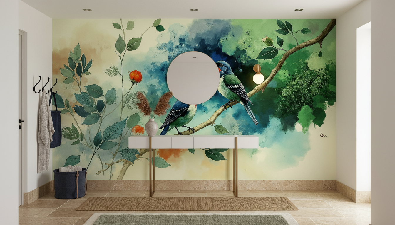 Laissez-vous emporter par le chant mélodieux de ces oiseaux exotiques qui semblent s’élancer depuis les branches pour venir habiter vos murs d’une grâce naturelle saisissante.