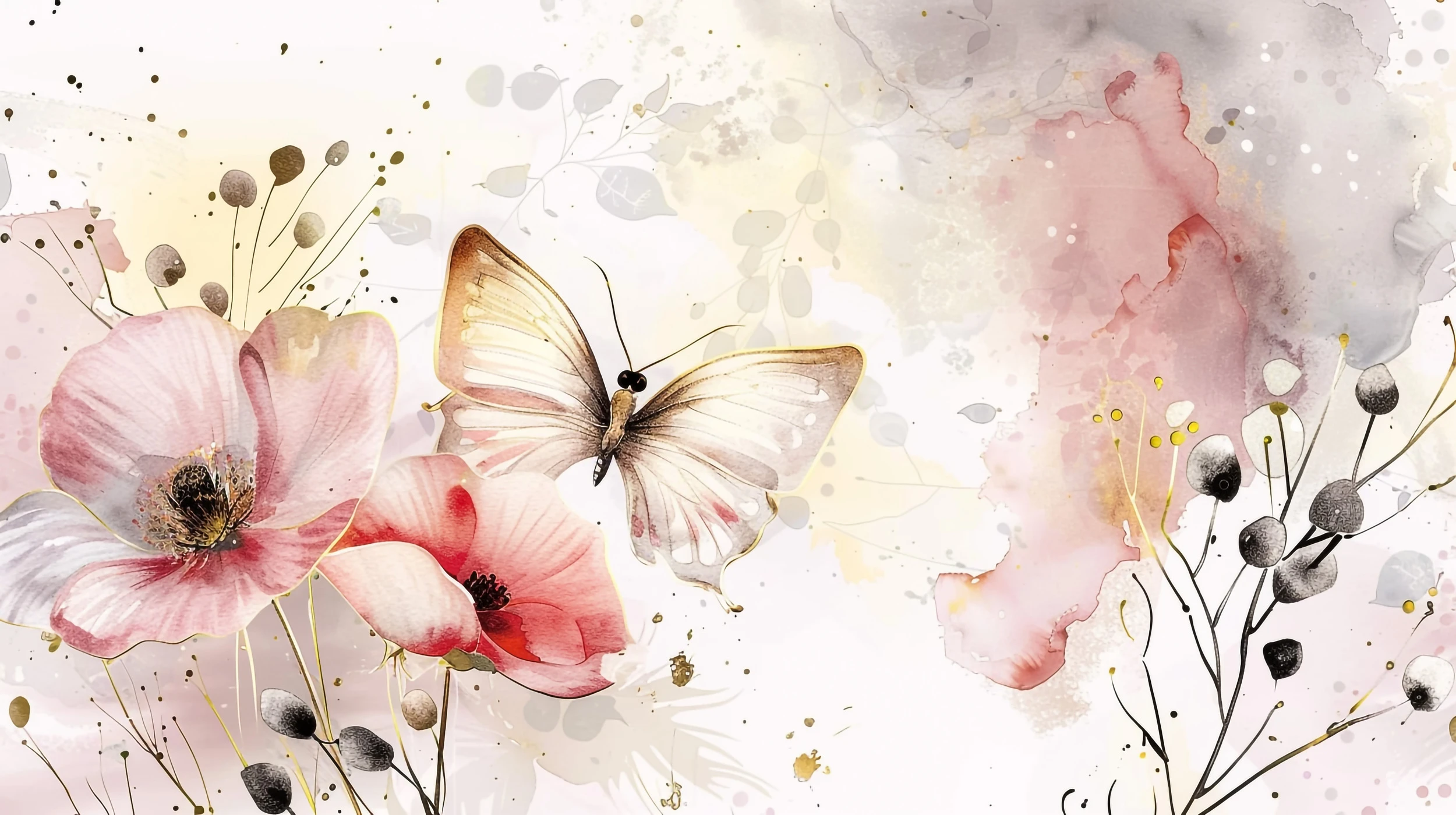 La technique de l’aquarelle moderne confère à ce papier peint une texture unique, où les couleurs se fondent naturellement dans des nuances poudrées allant du blanc cassé au rose ancien, rehaussées de touches subtiles de gris perle et d’ocre doré. Les éclaboussures artistiques et les effets de transparence créent un rendu authentique, comme si chaque fleur avait été peinte à la main par un artiste inspiré.