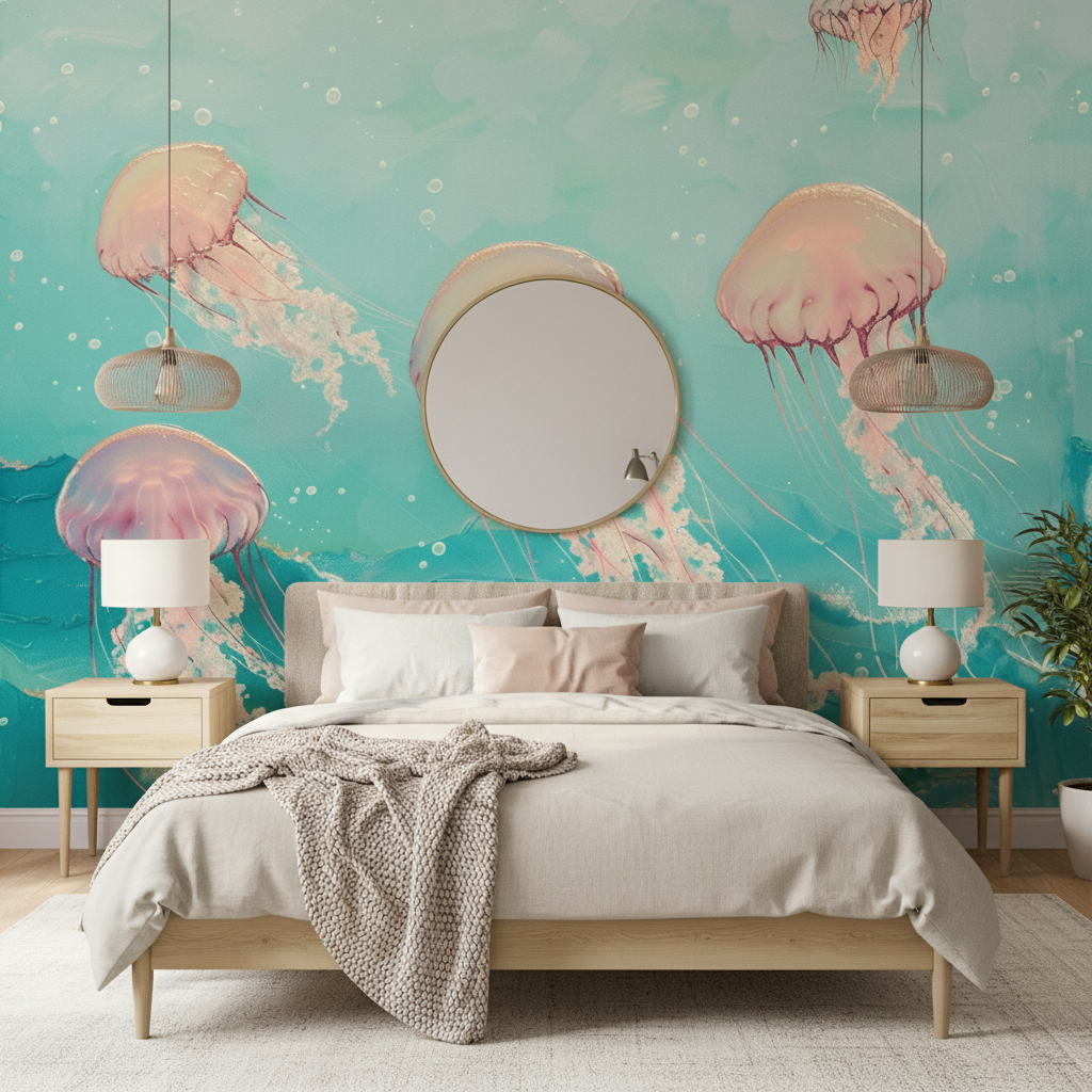 Côté styling, harmonisez ce papier peint bleu turquoise avec des matériaux naturels comme le bois flotté, le rotin tressé ou le lin froissé dans des teintes blanc cassé et beige. Les accessoires en laiton brossé ou en cuivre patiné réchaufferont l’ensemble, tandis que des coussins roses poudrés feront écho aux nuances délicates des méduses. Quelques plantes tropicales aux feuillages généreux compléteront cette ambiance nature aquatique.