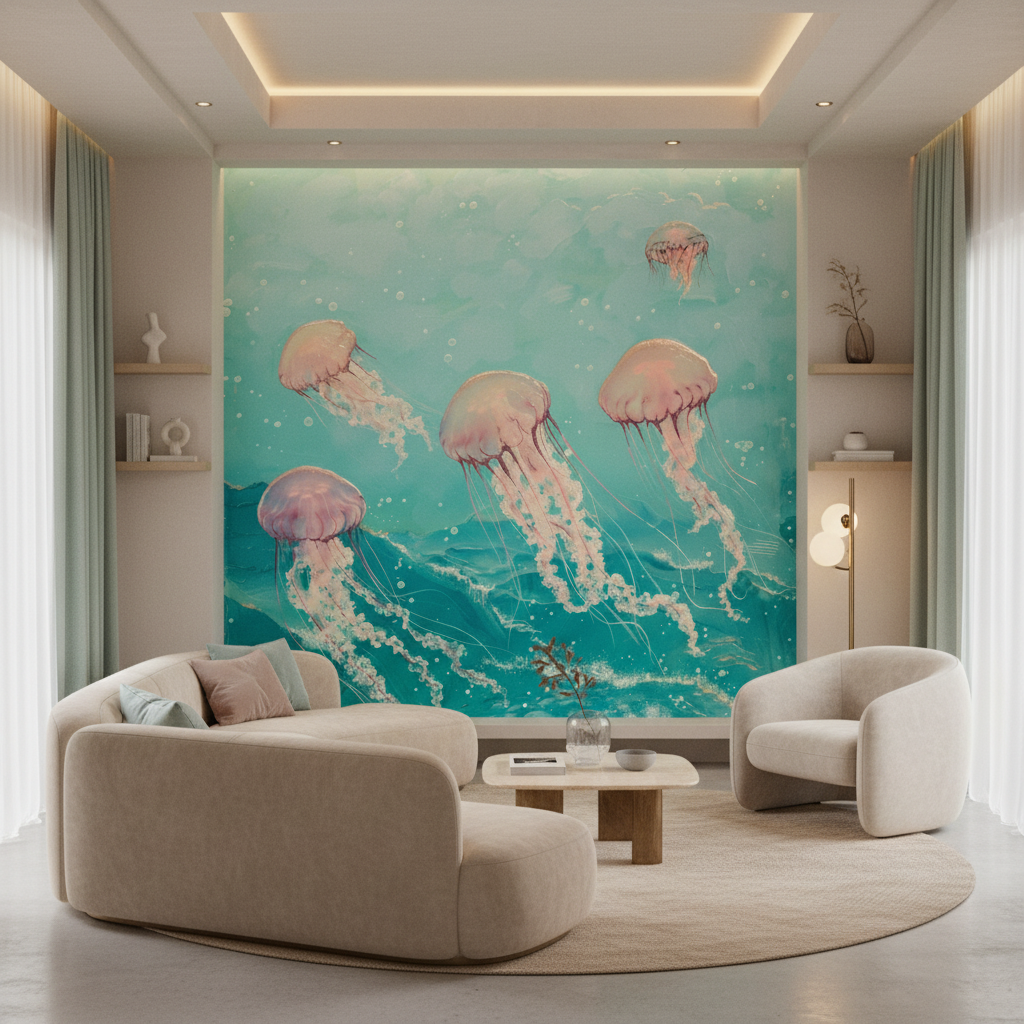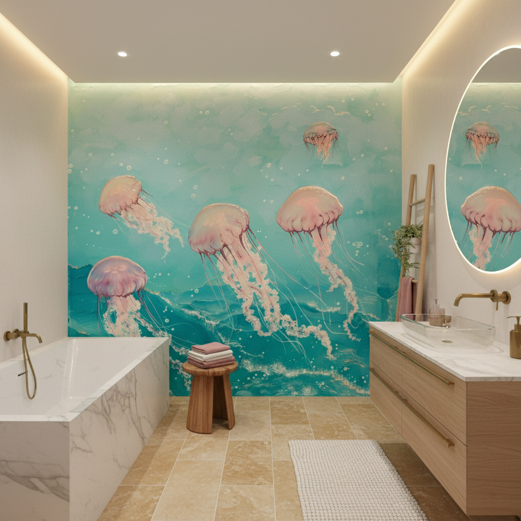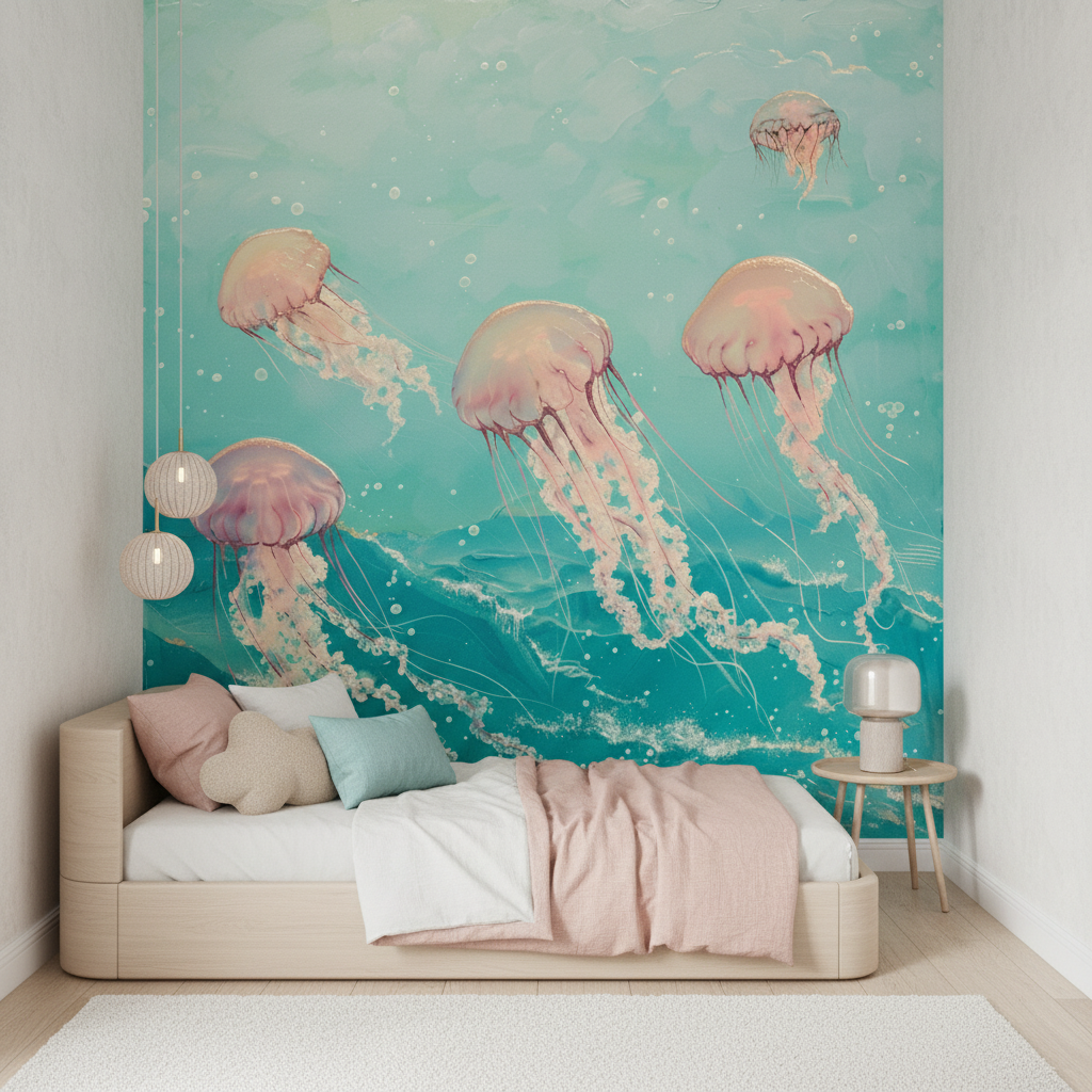 La technique picturale impressionniste confère à ce papier peint aquatique une texture vivante et organique, où chaque méduse semble animée d’un mouvement perpétuel. Les tons pastel – du rose chair au beige irisé – se marient harmonieusement avec le bleu-vert profond des abysses, créant une palette chromatique d’une douceur infinie.