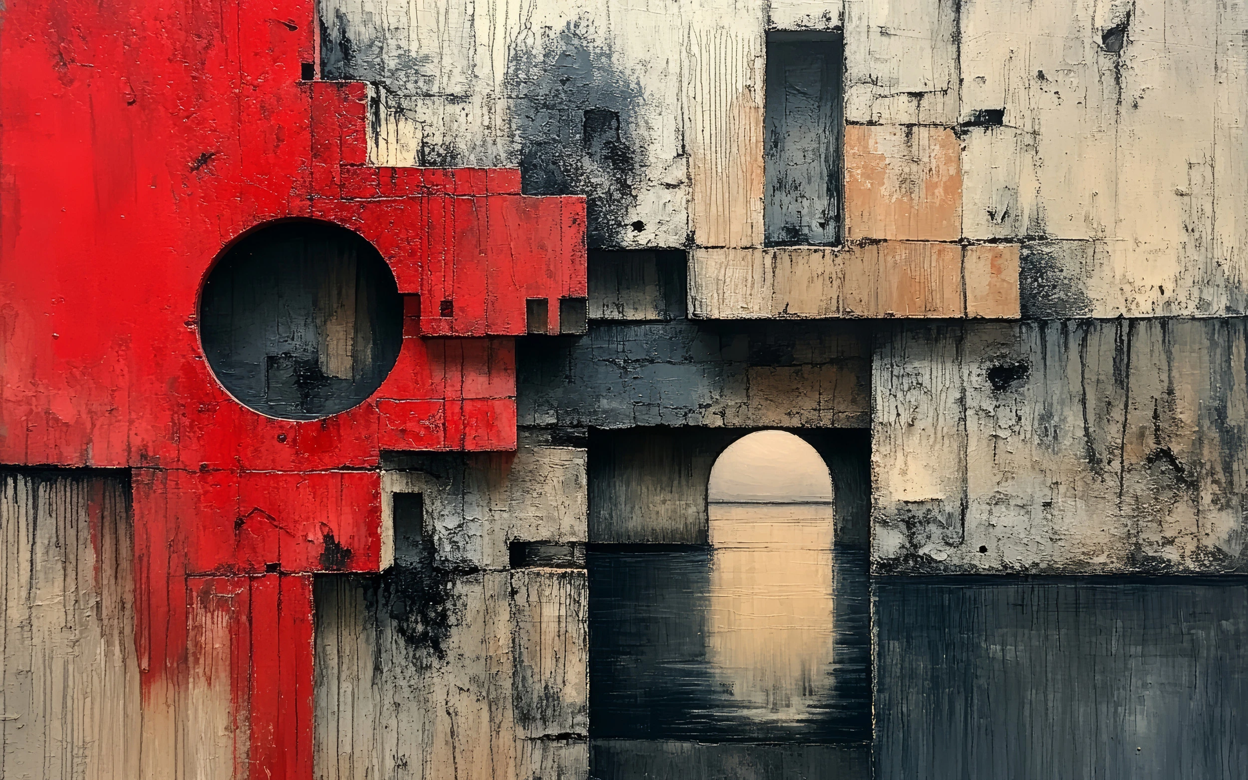 Cette création artistique dévoile un assemblage fascinant de formes géométriques aux allures architecturales. Les blocs colorés s’entremêlent dans une composition savamment orchestrée, où dominent les tons neutres de béton brut rehaussés par des touches de rouge vermillon éclatant. Les ouvertures circulaires et rectangulaires créent un jeu de pleins et de vides rappelant les fenêtres d’un immeuble brutaliste revisité par un regard artistique contemporain. La texture vieillie et les patines naturelles apportent une dimension tactile saisissante, évoquant le passage du temps sur des murs de béton patiné.