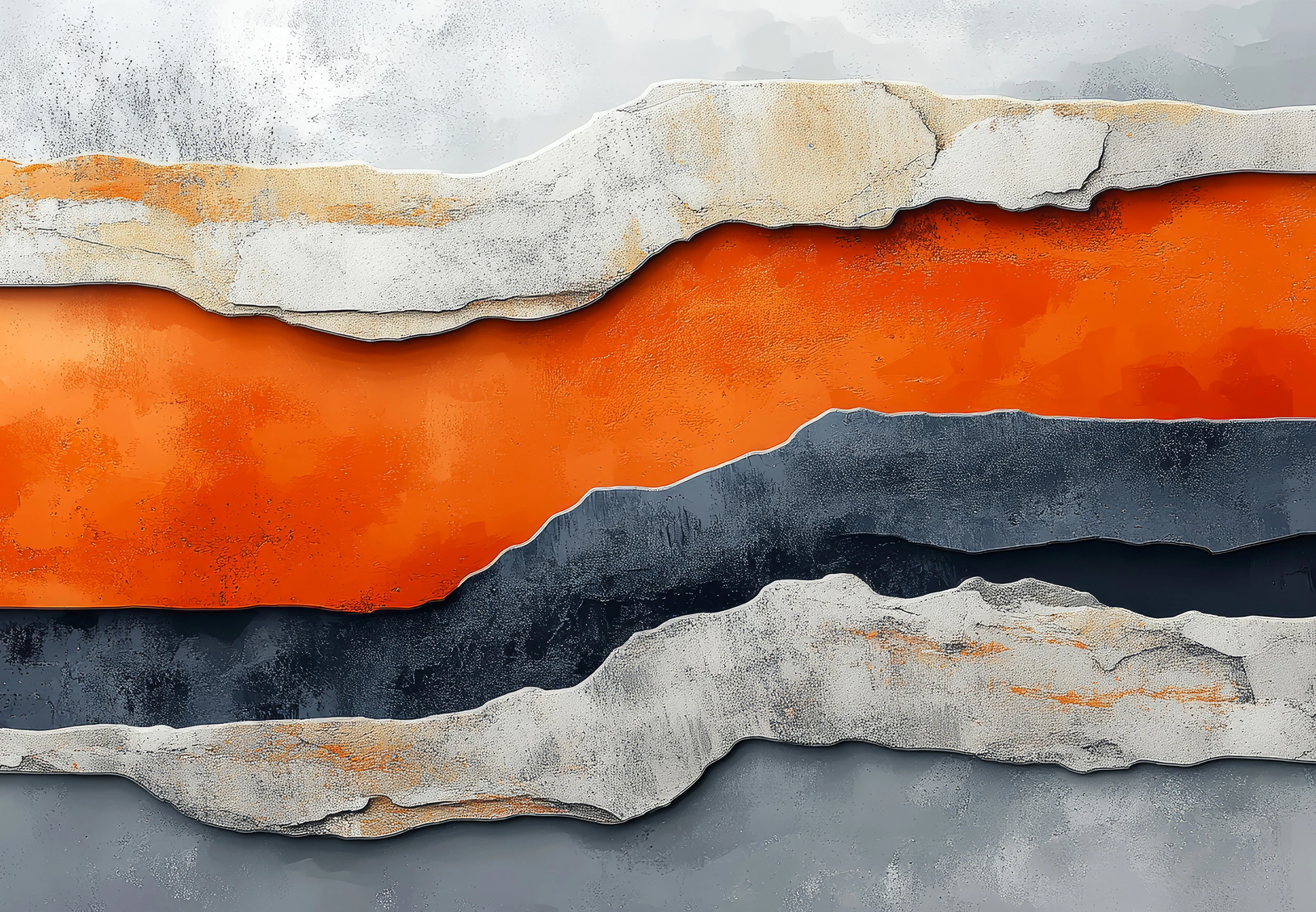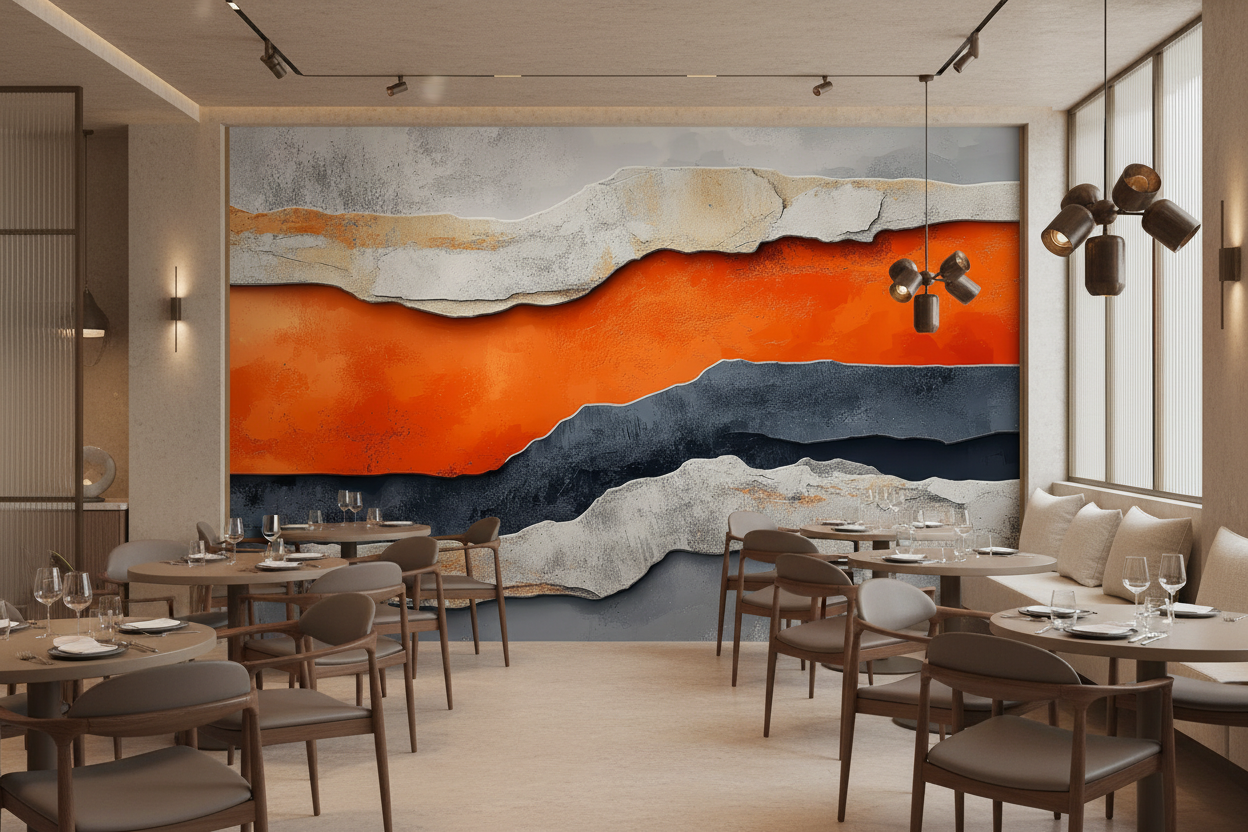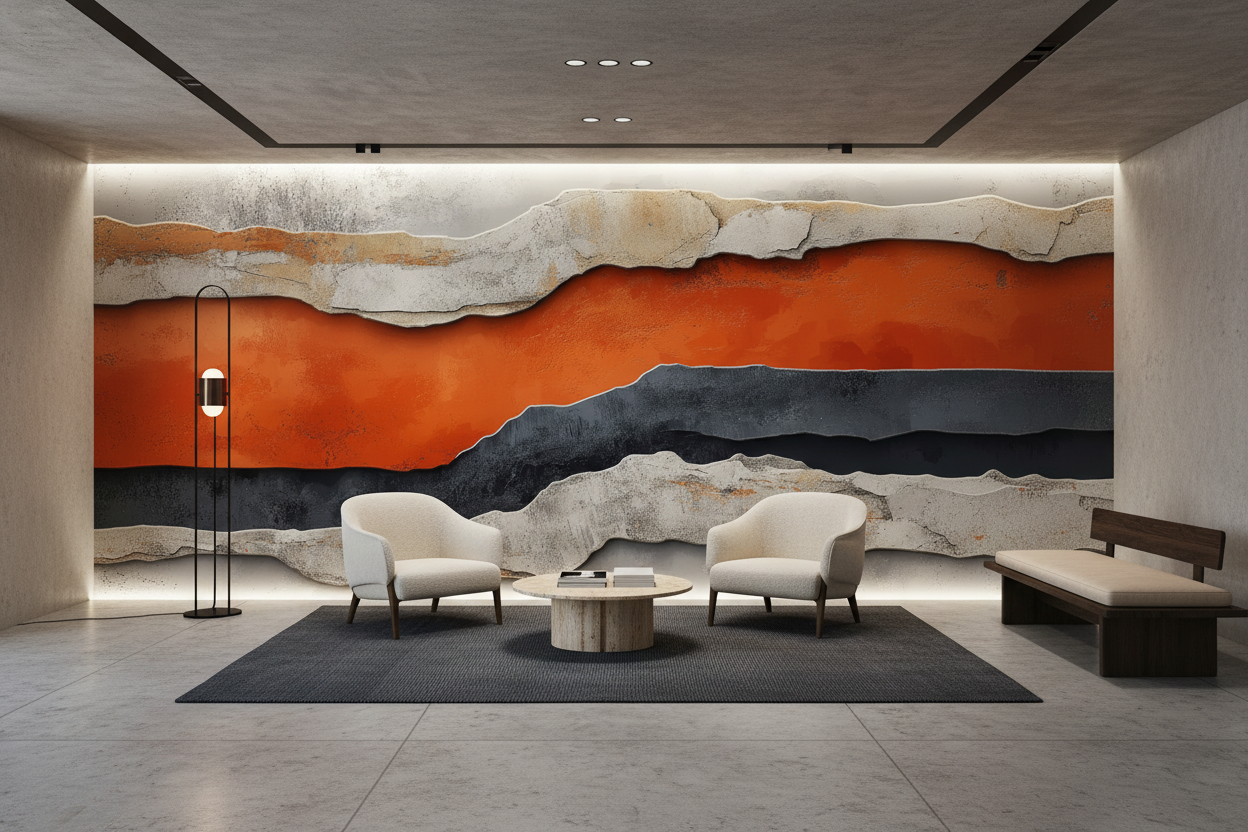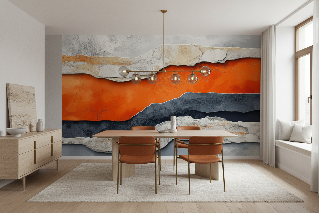 Ce papier peint artistique contemporain dévoile une composition fascinante de couches géologiques stylisées, où dominent de magnifiques tons orange vibrants qui contrastent harmonieusement avec des nuances grises anthracite et des teintes beiges naturelles. L’effet de matière texturée évoque la pierre érodée par le temps, créant un relief saisissant qui semble presque tangible. Les formes organiques ondulantes rappellent les canyons sculptés par les éléments, offrant une perspective tridimensionnelle d’un réalisme époustouflant. Cette peinture murale moderne s’inspire de l’art géologique contemporain, mêlant abstraction minérale et réalisme texturé pour créer une véritable fenêtre sur un paysage imaginaire.
