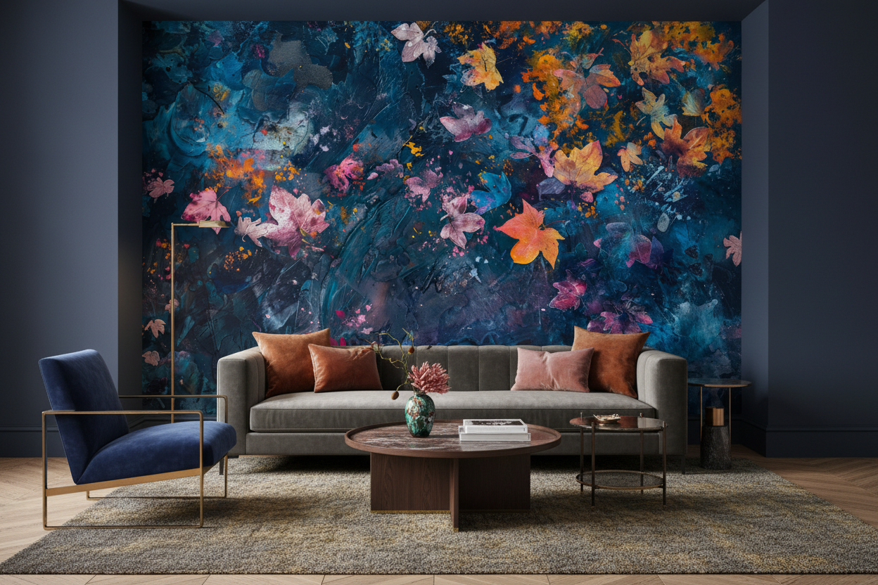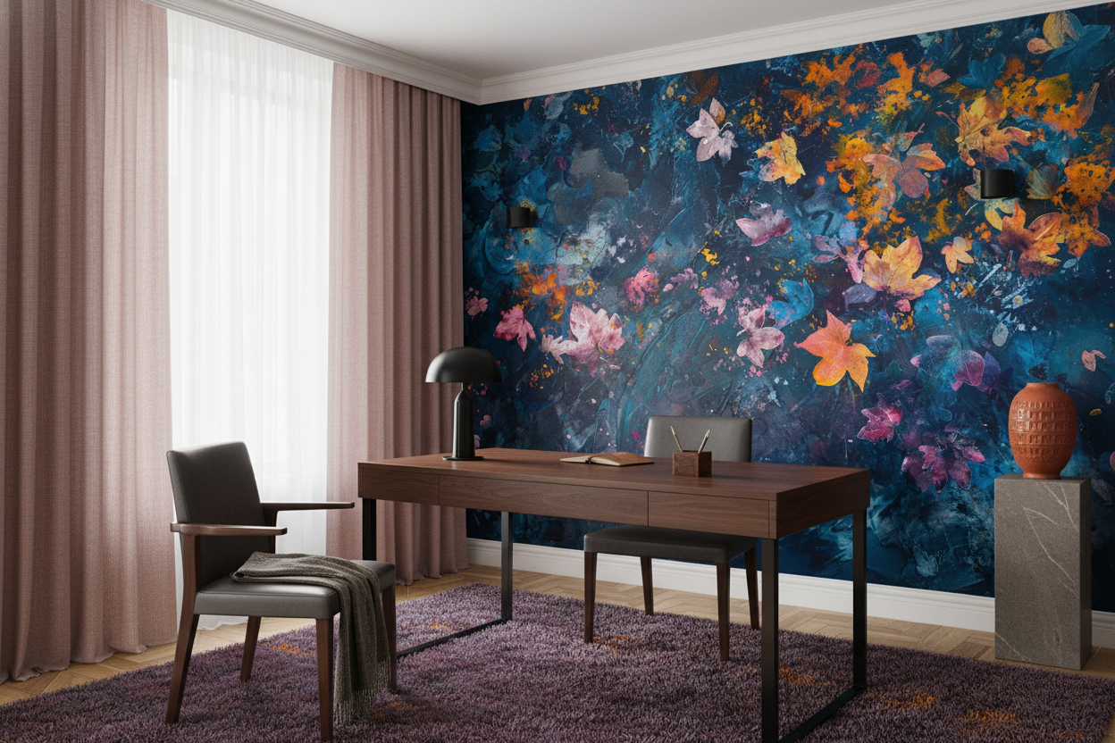 Cette création murale exceptionnelle présente un motif floral abstrait d’une richesse visuelle saisissante. Des feuilles d’érable stylisées aux teintes roses poudrées, oranges flamboyantes et violettes délicates se détachent majestueusement sur un fond bleu profond aux nuances océaniques. L’ensemble évoque la technique de la peinture acrylique avec ses empâtements et ses éclaboussures colorées qui créent une texture visuelle captivante. Les couleurs automnales se mêlent harmonieusement aux tons bleus et turquoise, créant un contraste saisissant qui évoque à la fois la fraîcheur marine et la chaleur des feuillages d’automne.