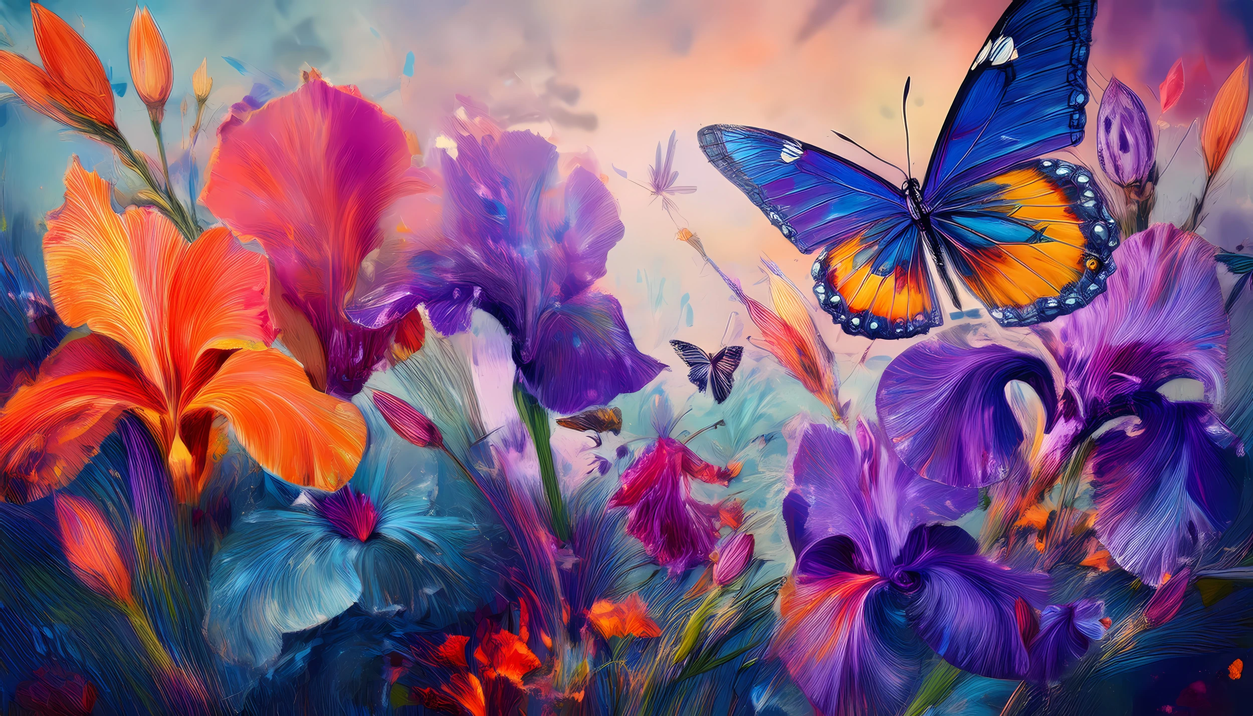 Ce papier peint tropical révèle un spectacle saisissant de beauté florale, orchestré autour d’une symphonie de fleurs exotiques aux teintes éclatantes. Des iris violets aux nuances profondes côtoient des lys orange flamboyants, créant un contraste saisissant qui évoque les plus beaux jardins botaniques. Au cœur de cette composition artistique, un majestueux papillon bleu aux reflets métalliques déploie ses ailes chatoyantes, symbole de liberté et de transformation. Le style pictural, d’inspiration aquarelle moderne, révèle des coups de pinceau expressifs qui donnent vie à chaque pétale et subliment les détails naturalistes.